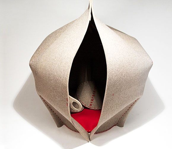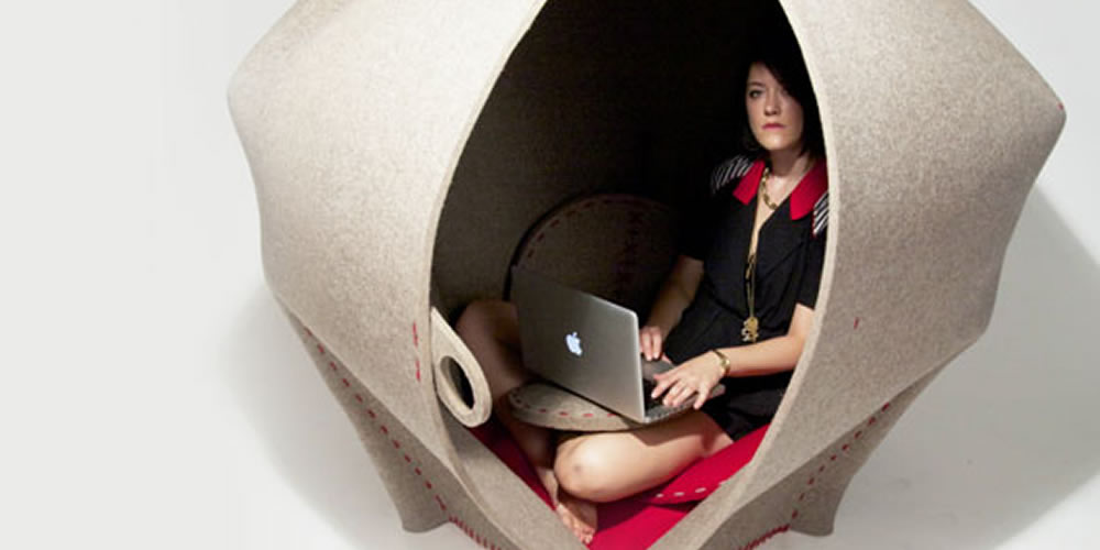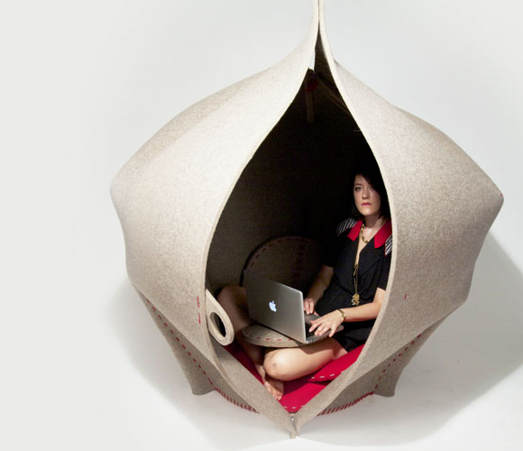 British designer Freyja Sewell has created an intimate, enclosed space with a felt cocoon that can serve as a luxurious retreat in solitude, a work corner, a quiet rest area or as a peaceful oasis in the middle of a crowded public space.