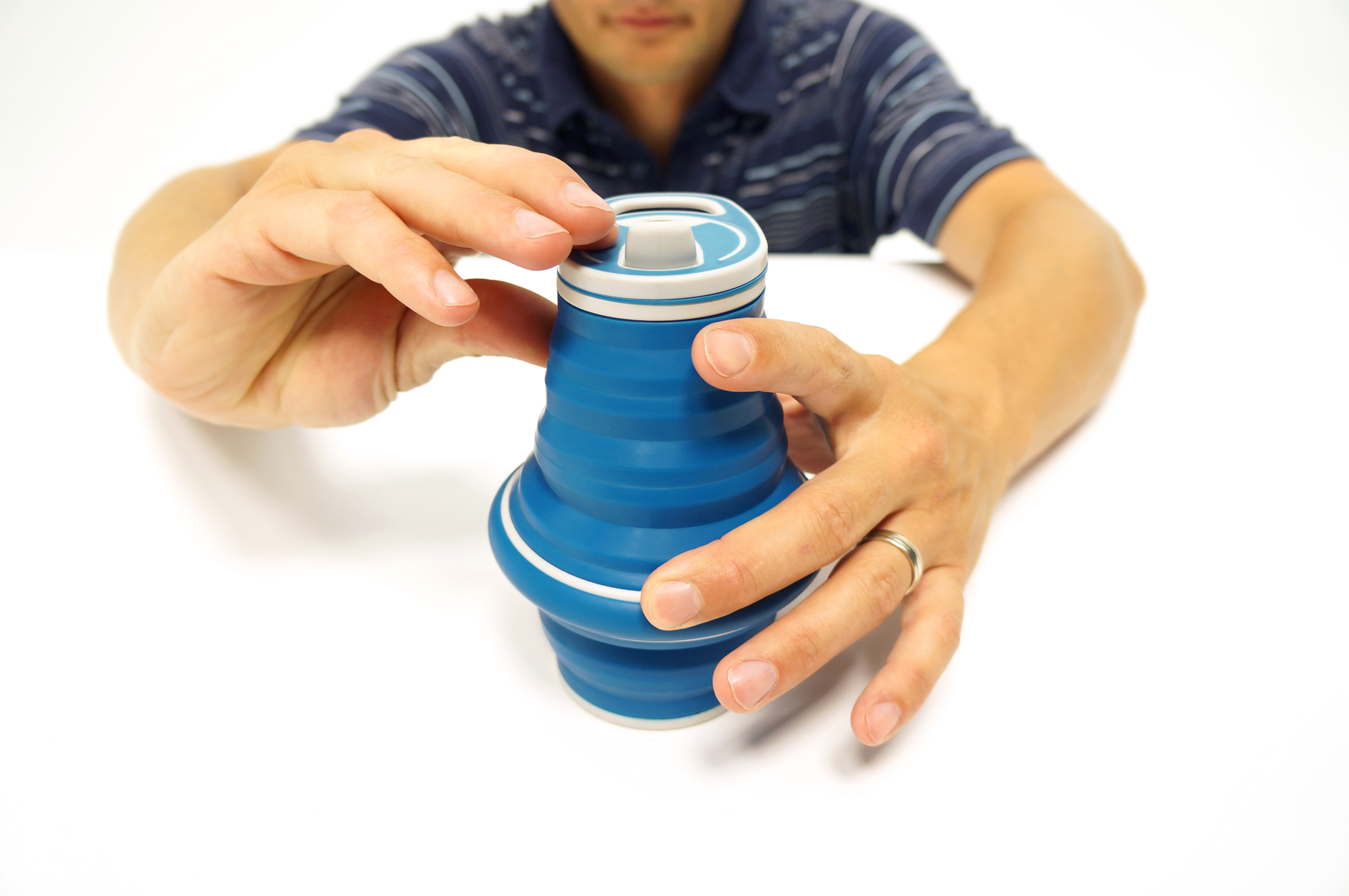 With unique safety buckle (carbine), which buyers will receive for free because it is a project on Kickstarter collected over 100 thousand dollars, you will be able to attach the collapsible chutara anywhere. And if the bulk of the chutara is done from silicone, the cover and plug are from environmentally friendly plastics. It has neither smell nor taste, and when folded it is as thick as a compressed can (3.2 centimeters). The larger one weighs 160 grams and the smaller one 110 grams, and the first buyers will already have them August 2015.