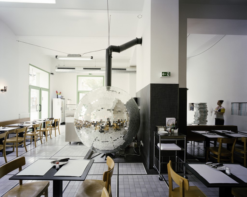 As the central object, he installed a fully functioning bread oven in the shape of a giant glowing disco balls. Covered with approx 7,500 pieces of glass, illuminated by brightly colored spotlights and rotating at 1 revolution per minute, in the evenings offers a whirlwind of light travel back in time to the Italo-disco era of the 70s and 80s.