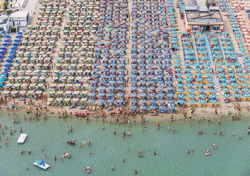 German photographer Bernhard Lang he lives and works in Munich, and his "specialty" is aerial photography. Until now, he mainly photographed the German landscape from the air: mines, settlements and industrial parts of Germany. But he visited years ago resort Adria in Italy. There, he was impressed by the placement of colorful umbrellas on the beaches, which are everywhere arranged in straight rows. The scene clearly did not give him peace, because he returned this year - except with a plane, from which he spent several hours photographing the coast between the cities of Rimini and Ravena.