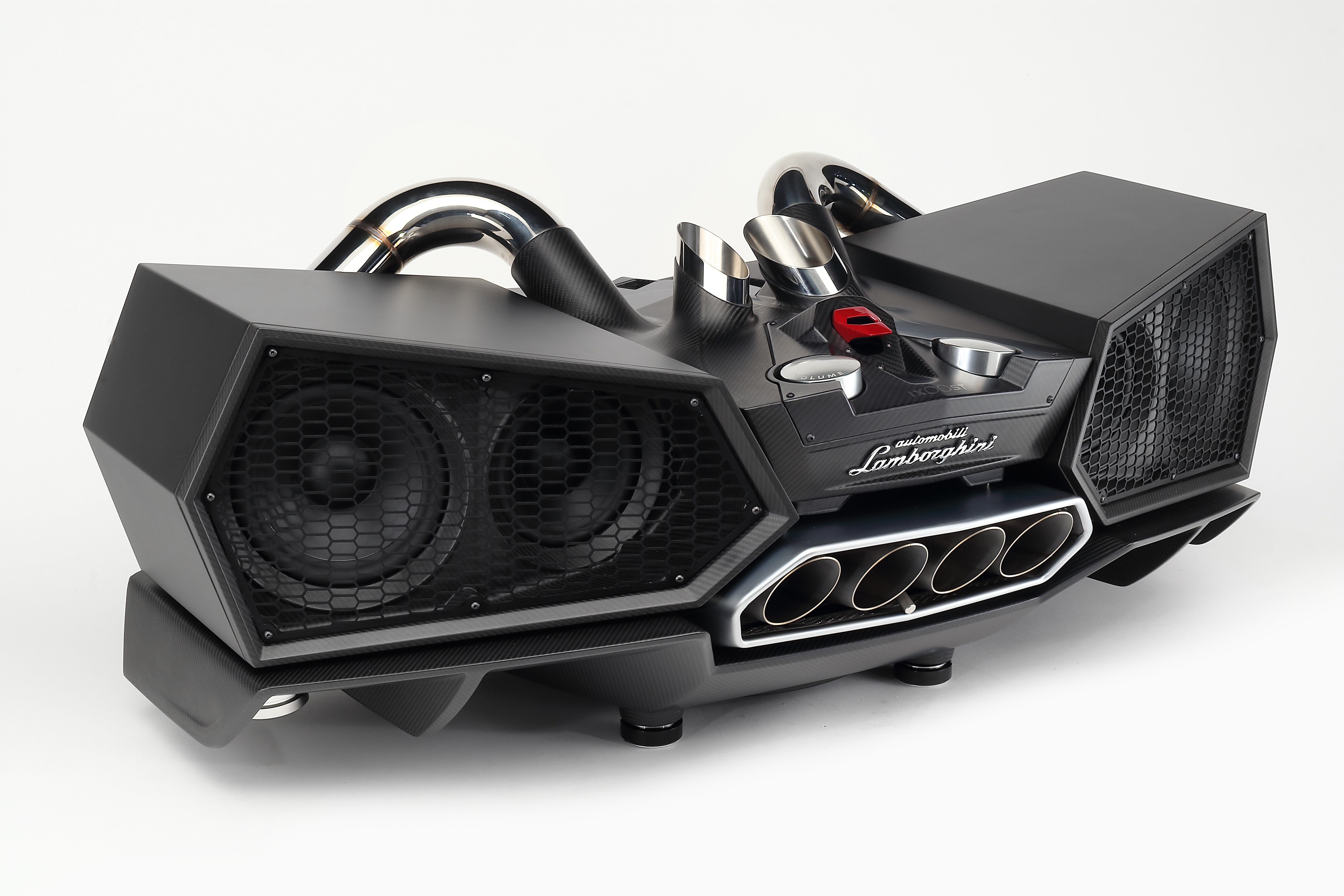 Self-supporting carbon fiber bodywork, passive shock absorbers and a Lamborghini exhaust system. You might think we're describing the Aventador LP 750-4 Superveloce, but we're talking about the iXOOST Esavox Lamborghini sound system. This one boasts passive speakers and a 600-watt amplifier (with 800 W of total output power). It is made from an original Lamborghini exhaust system.