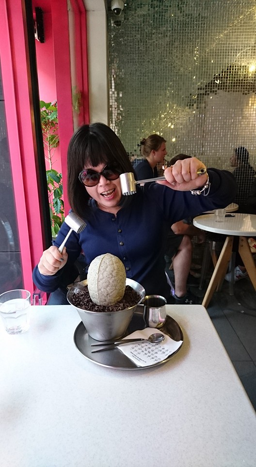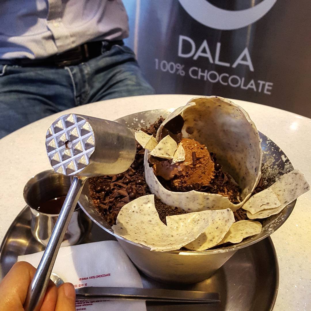 … a chocolate dinosaur, what did you think! Attractive chocolate dinosaur egg served in a South Korean cafe She gave 100%-Chocolate in Busan. To get hold of the surprise (a standing chocolate dinosaur on a scoop of ice cream), you must: a) with a silver hammer hit the chocolate egg and break it or b) pour over the shell hot chocolate and let it melt enough to reach inside.