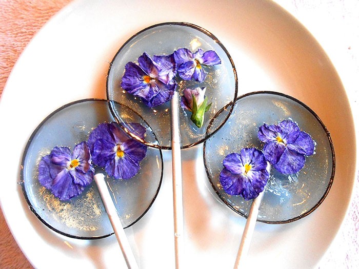Lollipops with flowers are culinary creations Janet Best from the bakery Sugar Bakers Bakery, which can be ordered in the online store Etsy.com, where available with different flavors and flowers. All the flowers were grown indoors where they were protected from insects and toxins before being immersed in the sweet liquid. Although the flowers themselves do not give the lollipop flavor, they are lollipops that resemble fossils in amber, definitely a feast for the eyes and the stomach.