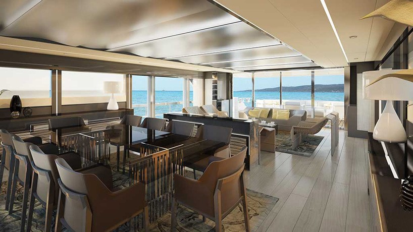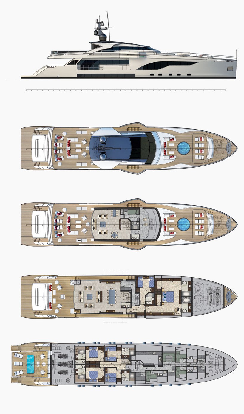 The maximum speed that the Wider 125 can reach is 14 knots, with width 7.93 meters but we can't talk about how cramped it is, and the numerous panoramic windows give it additional width. It has four guest cabins, which can sleep 10 people, and there is also a luxury cabin on the main deck. There is also a special family area, the gym, as well as a swimming pool, a jacuzzi, a salon, and let's not forget about garage, where you can drive yours 5.5 m long speedboat or a pair of jet skis. Otherwise, the pictures speak for themselves.