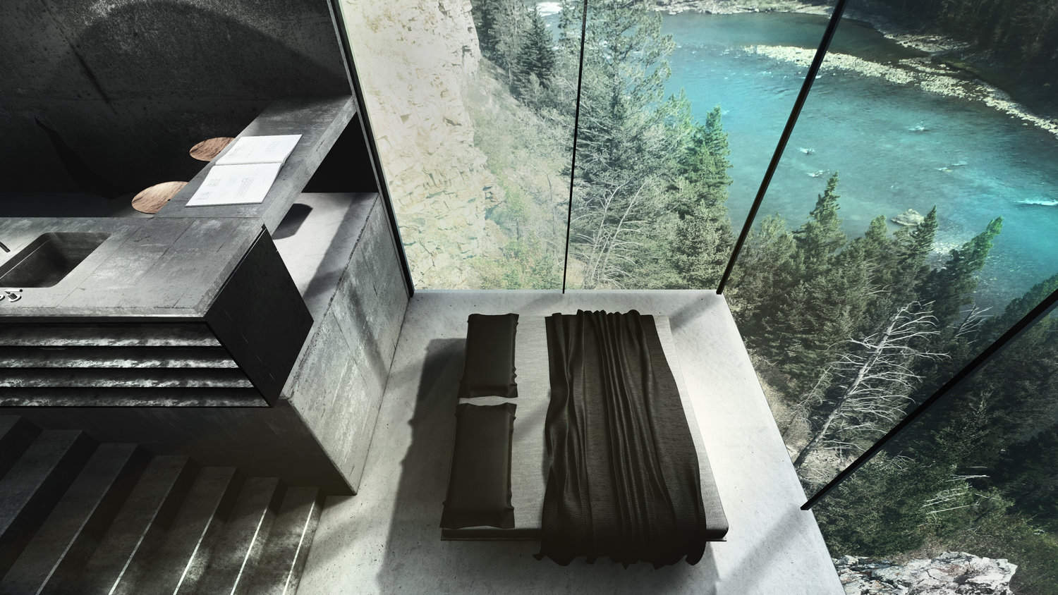 The primary feature of a concrete house Maralah it is away from the hustle and bustle of the city. They put her in a rocky reef, so she is partially submerged in the rock, and partly cantilevered over it. It is built of raw concrete, matt black steel and glasses. Two sides are completely glazed, which offers the visitor extremely beautiful view of the landscape and the turquoise blue river flowing beneath it.
