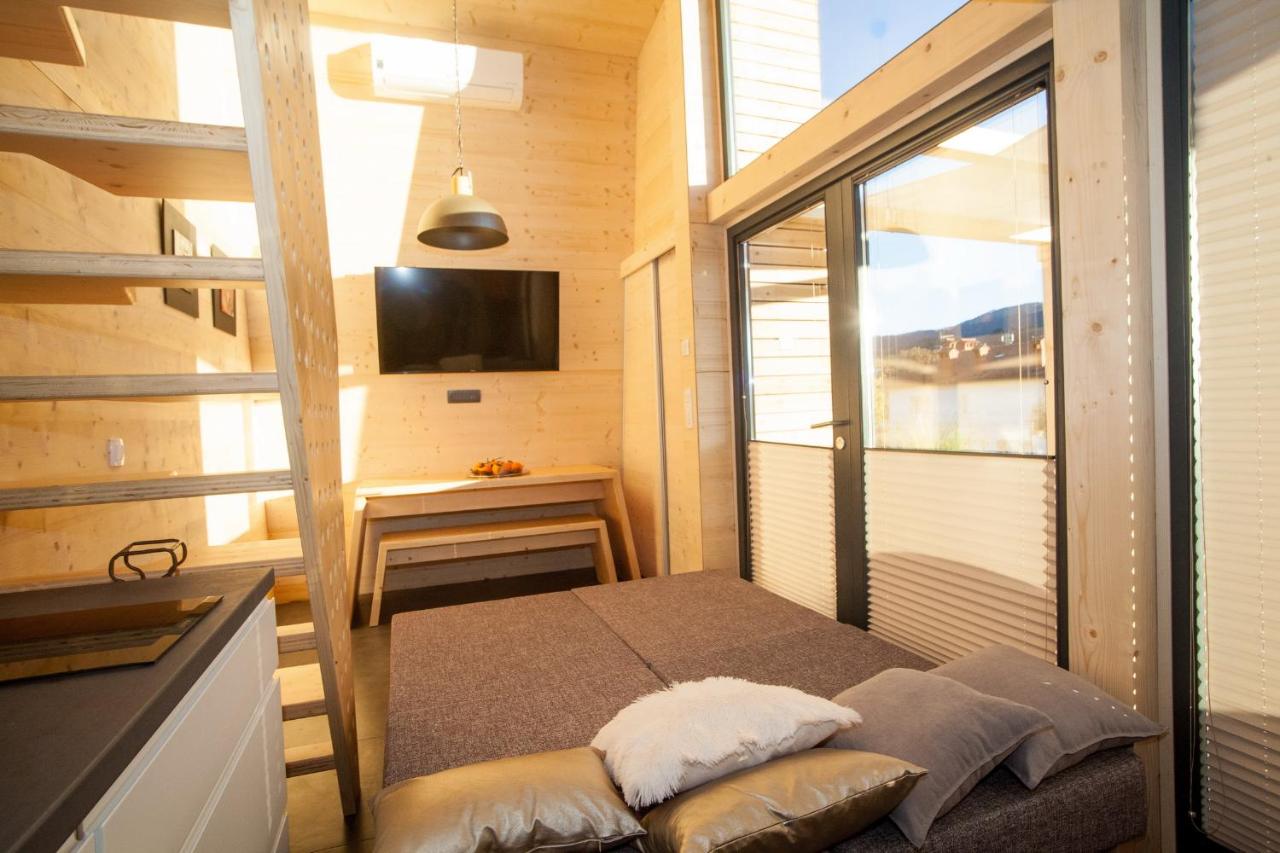 MAXI can accommodate four people, and in it you will find a spacious kitchen with a dishwasher, a bathroom, a living room and a separate bedroom with a double bed. MAXI breathes together with nature, as only natural materials were used in its construction, and its design is self-sufficient and energy-saving.