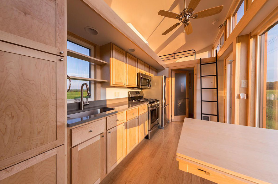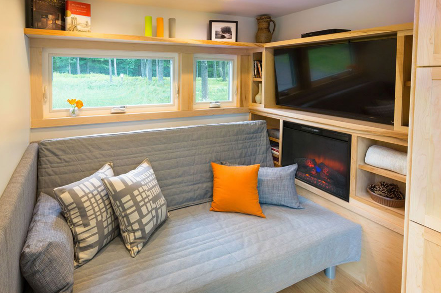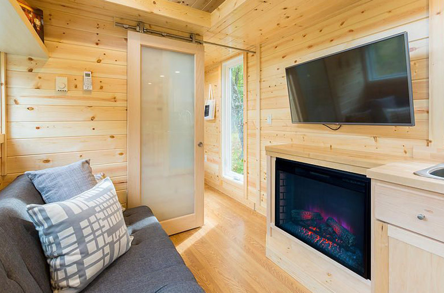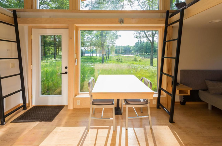 Plenty of windows and pine floors ensure this portable microhome is constantly flooded with light. Drawers and cabinets provide space both for relaxation and for their essential task - storage.