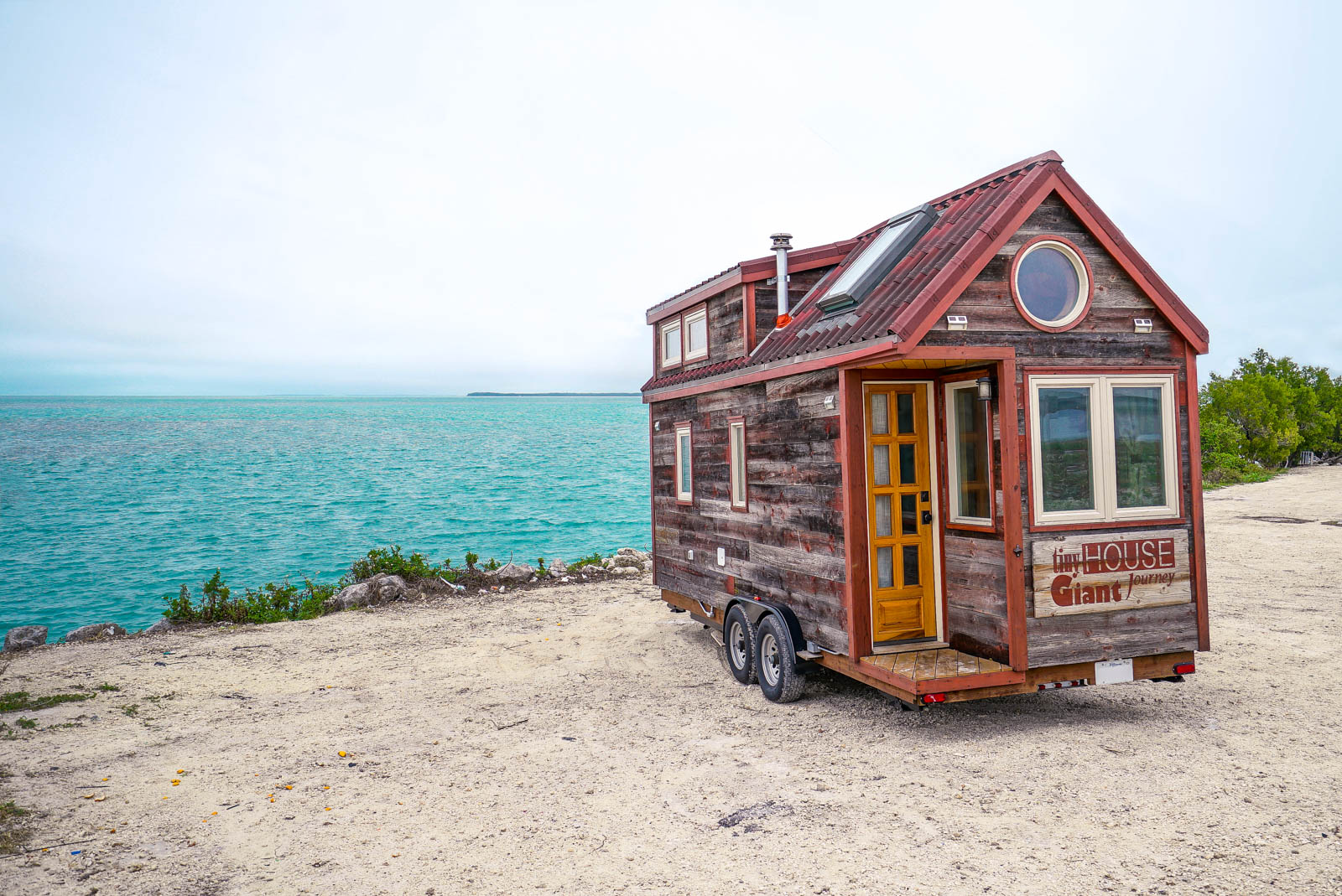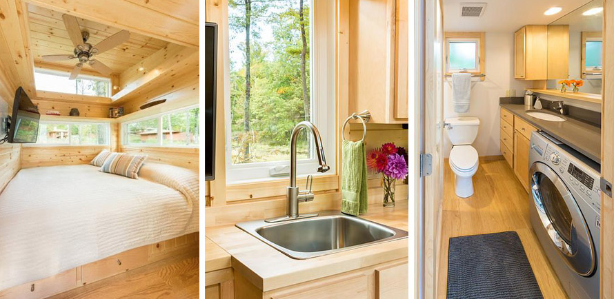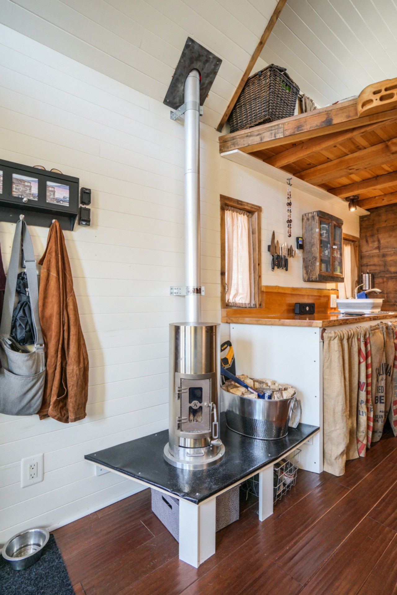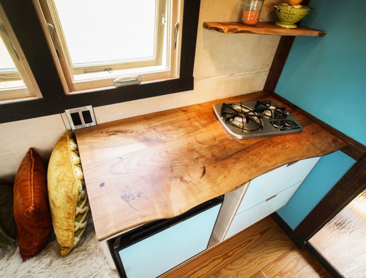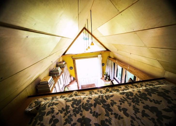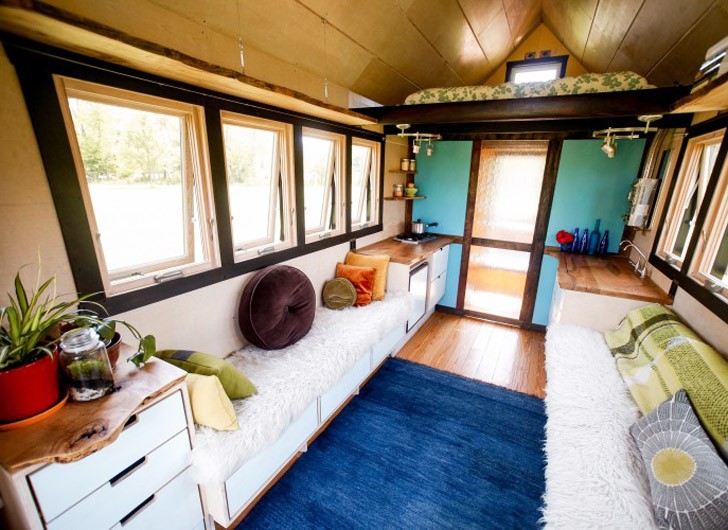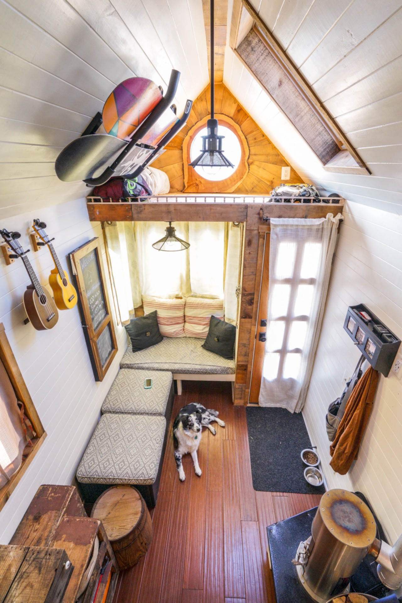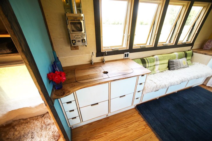 The owner of this tiny home turned an old school bus into a charming abode. The wooden paneling climbs up to the curved ceiling, while the built-in bed offers two spaces – a living room and a sleeping area.