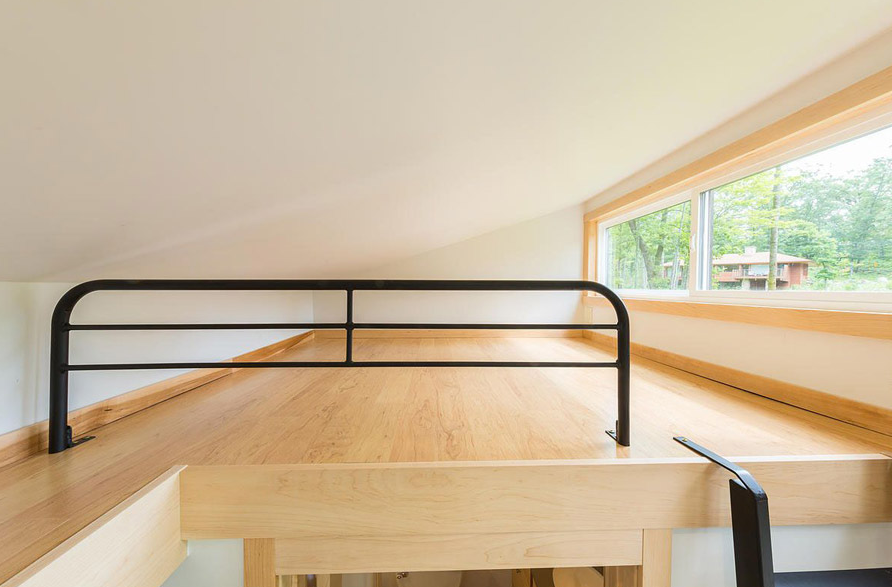 The extra high ceilings together with the whitewashed wooden walls offer a bright space and plenty of storage space. Built-in benches offer cushioned seating and storage, with a bed above.