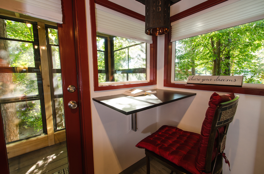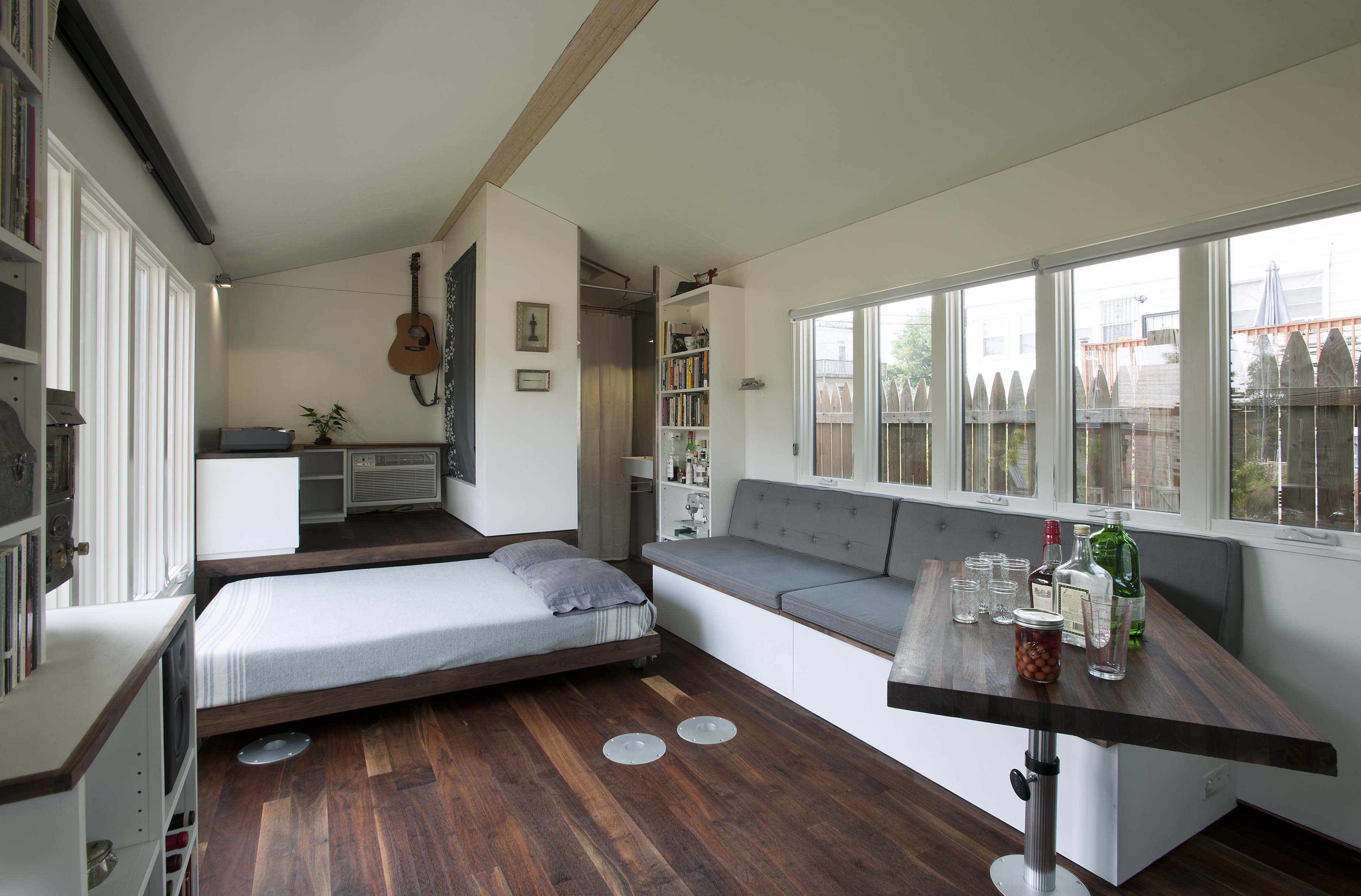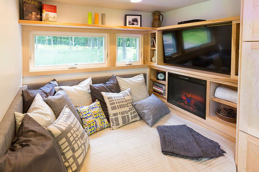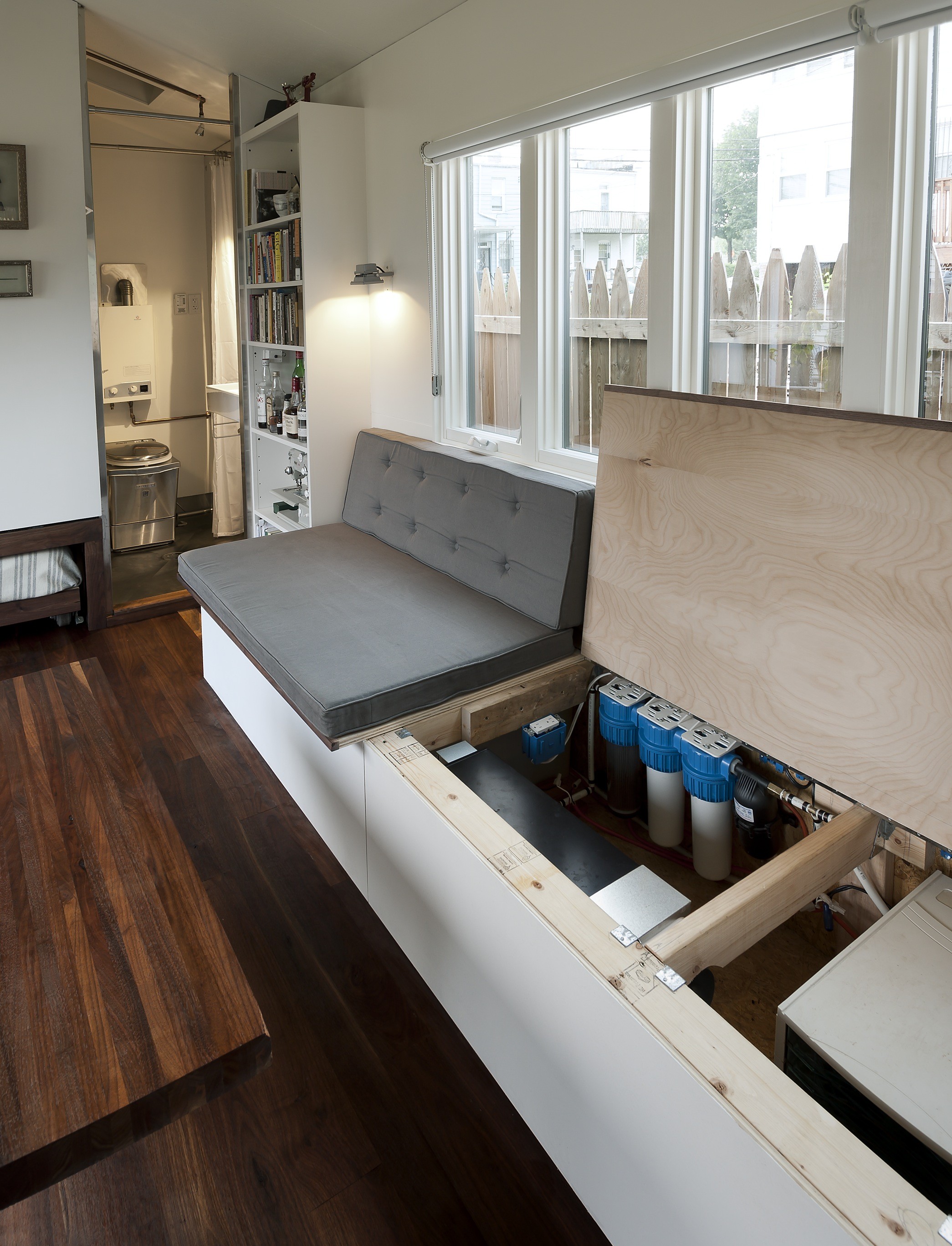 In this micro home, the bed rolls out from under the table, saving a lot of space in the home.