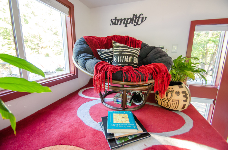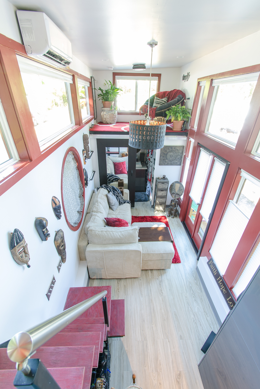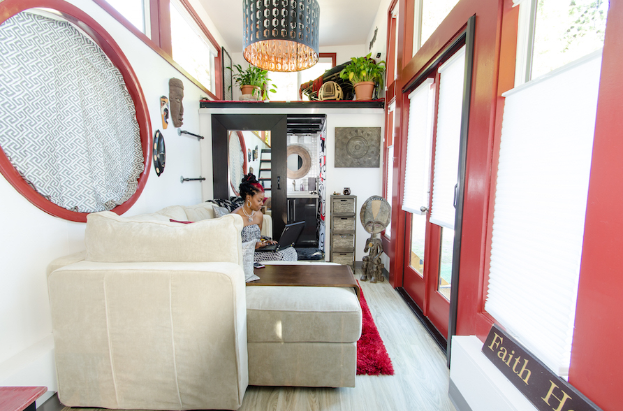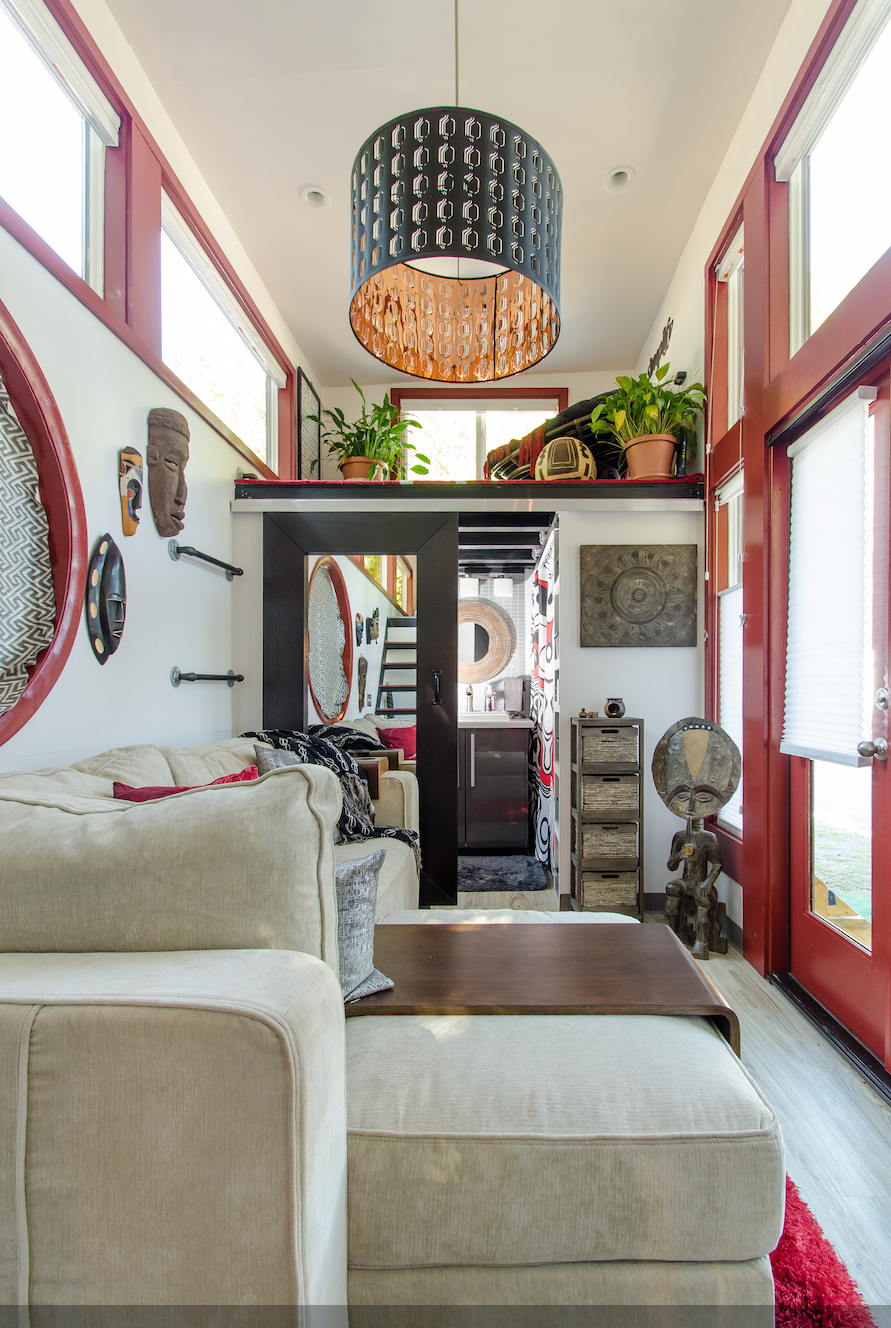 An eclectic mix of decor creates a unique look in this tiny house on wheels. A neutral sofa neutralizes the space and allows the red decorations and artwork to shine.