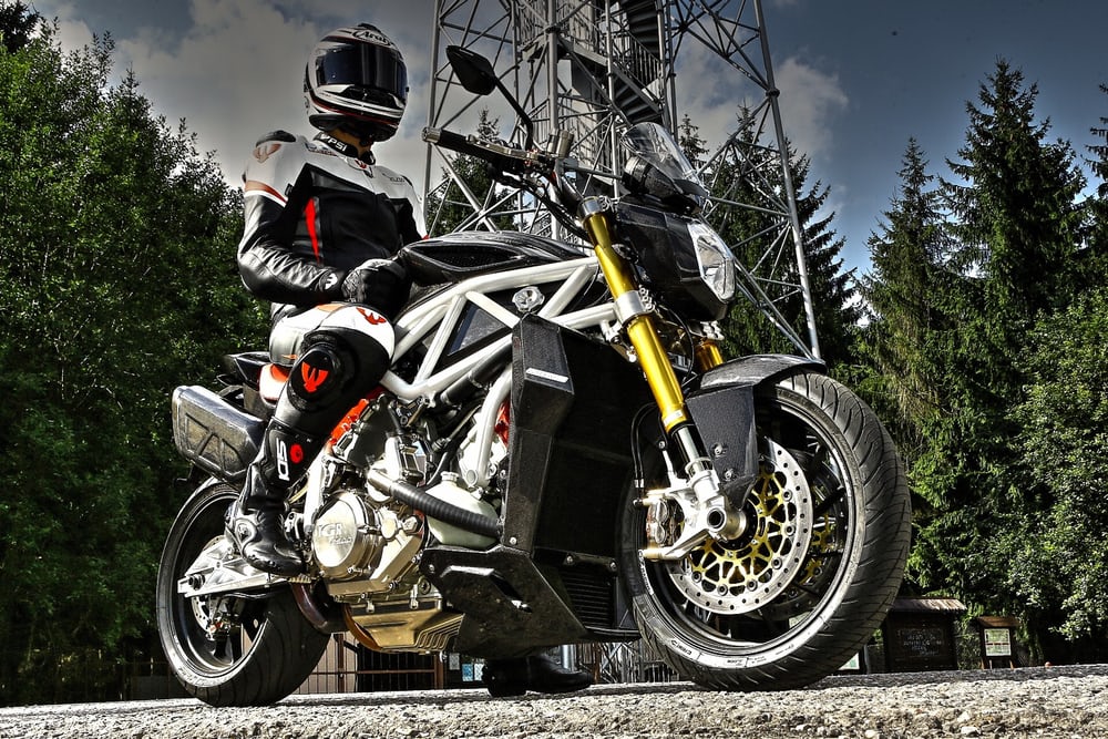 Armorless Midau, which grew on the lawn in 2004 Miroslav Felgra, who wanted a big sports engine, boasts with 240 horsepower (160 Nm of torque), heavy-duty 90-degree V6 unit, suspension Ohlins, premium brake discs Brembo, tubular frame Trellis (which is why it is agile and stable at the same time), technically sophisticated aluminum rear suspension and six exhausts.