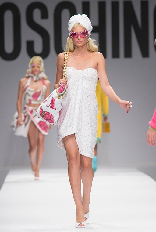 On Milan Fashion Week are on The Moschinos dolls walked the runway at a fashion show Barbie in human size. The models, who wore fashionable creations of predominantly pink color, surprised with strong make-up, platinum curls and an authentic presentation in the classic Barbie style. One of them took the runway wearing roller skates, the other brought a pink plastic suitcase with her.