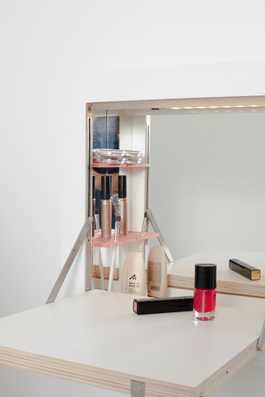 The Schminktank cabinet is characterized by high functionality, multi-purpose, modern design and small dimensions. We simply hang it on the wall, where it is closed almost imperceptibly. When we open it, we get a place to work, and the cabinet can also serve as a minibar or cabinet for first aid or make-up storage, as in addition to the storage space, we can find a light and a mirror in it.