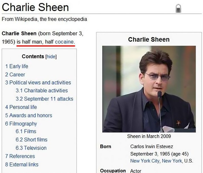 Nekdo si je drznil zapisati, da je Charlie Sheen pol človek pol kokain, nekdo pa je ustvaril članek na Wikipediji, ki se posveča kompleksu Boga in oziroma božjemu kompleksu, v to kategorijo je med drugim umestil tudi Kanye West. Na srečo takšne spremembe ne ostanejo dolgo, moderatorji jih namreč precej hitro opazijo, in to še preden ugledajo luč sveta. In da bi vam pokazali, kako smešna in drzna so lahko včasih ta urejanja, smo v galerijo umestili nekaj tistih najbolj zabavnih.