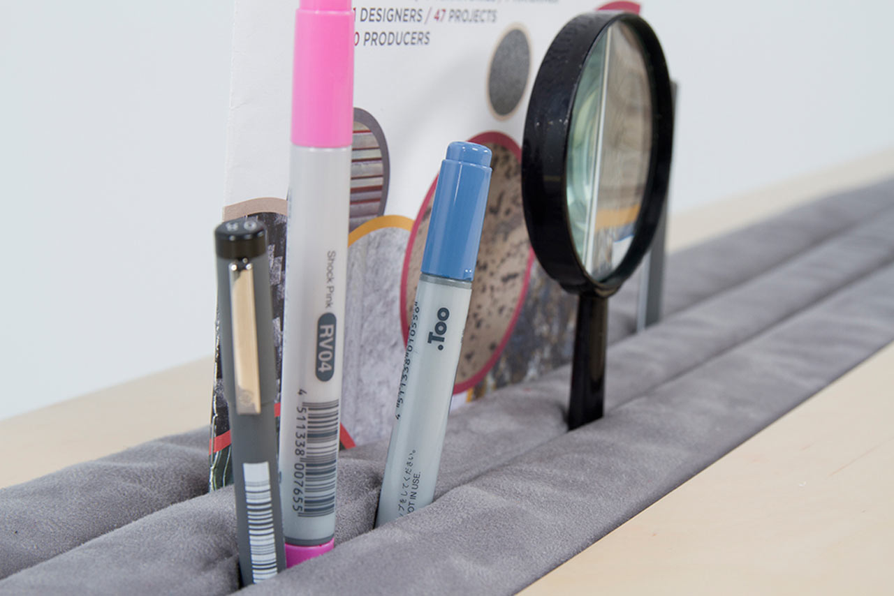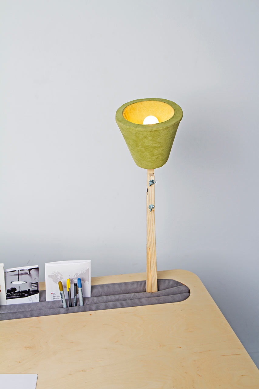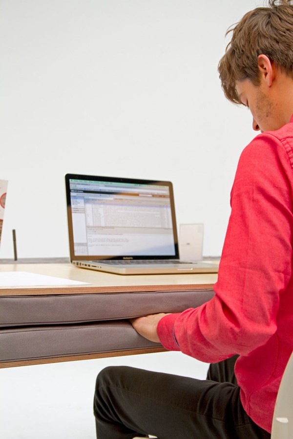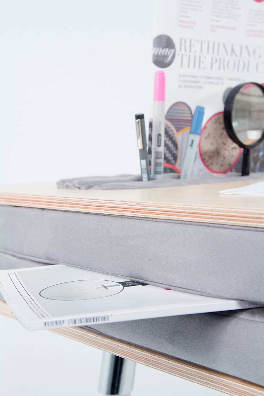 The table itself is formed by two leaders materials, which together create an excellent design idea. Alcantara in conjunction with the foam, it acts as a virtual sedvic clothed in the chipboard of the work surface. The space between the foam should serve as a storage place for papers and various objects. It would also allow the user a different storage experience.