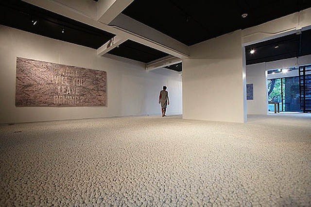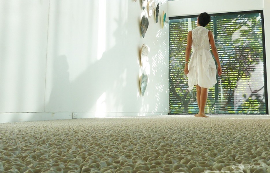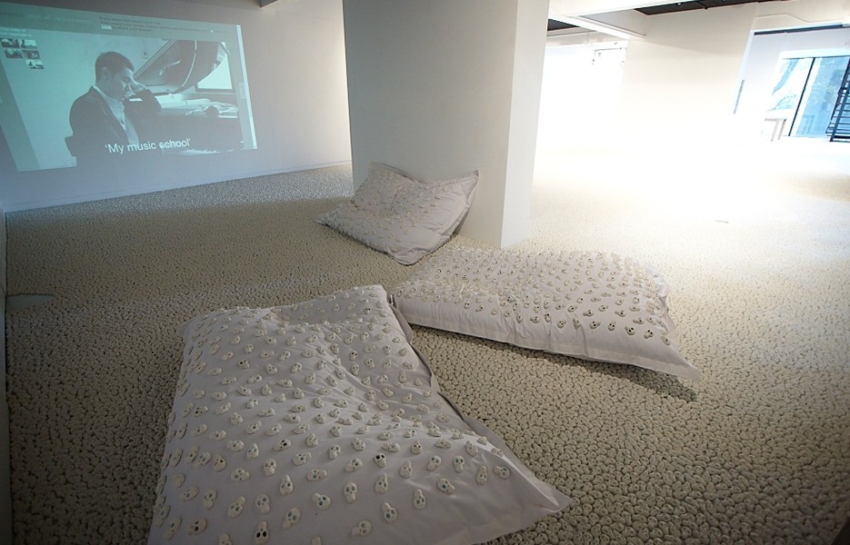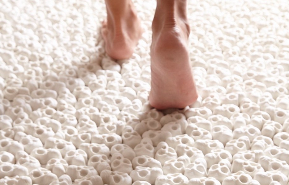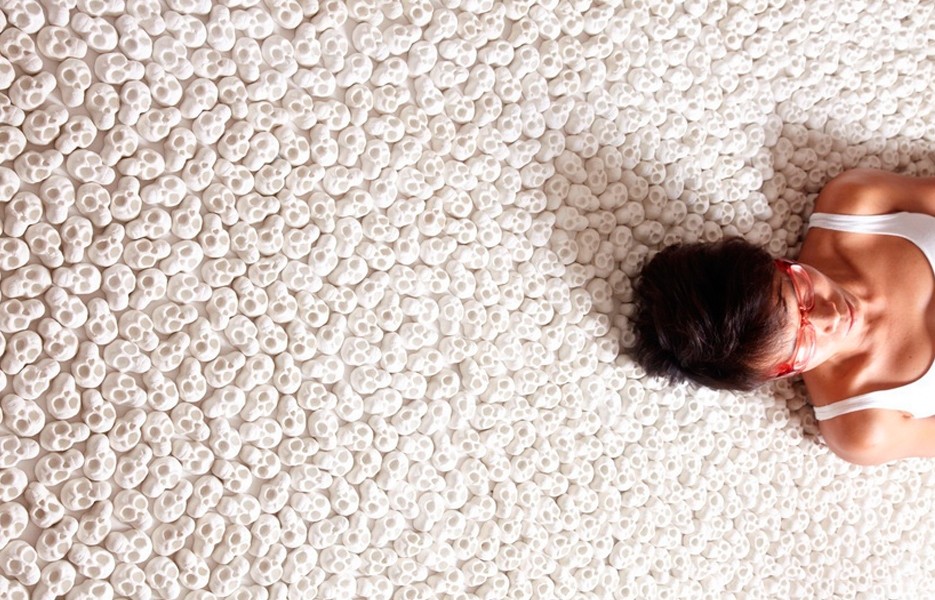 The exhibition by the artist Nina Sarabutra invited visitors to walk through 100,000 miniature porcelain skulls in search of their own imprint, which a person leaves behind with every step, right up to the last one.