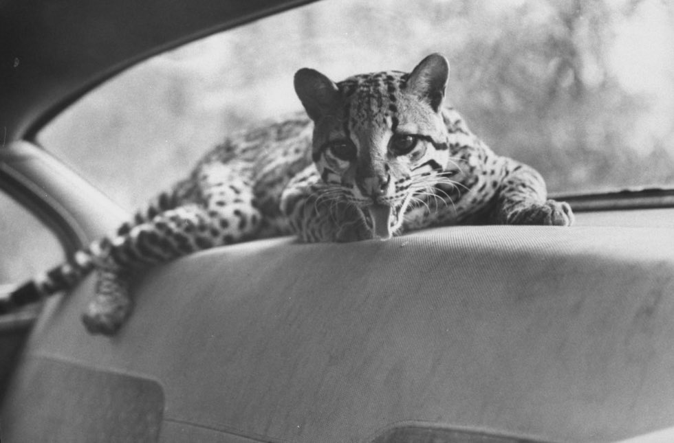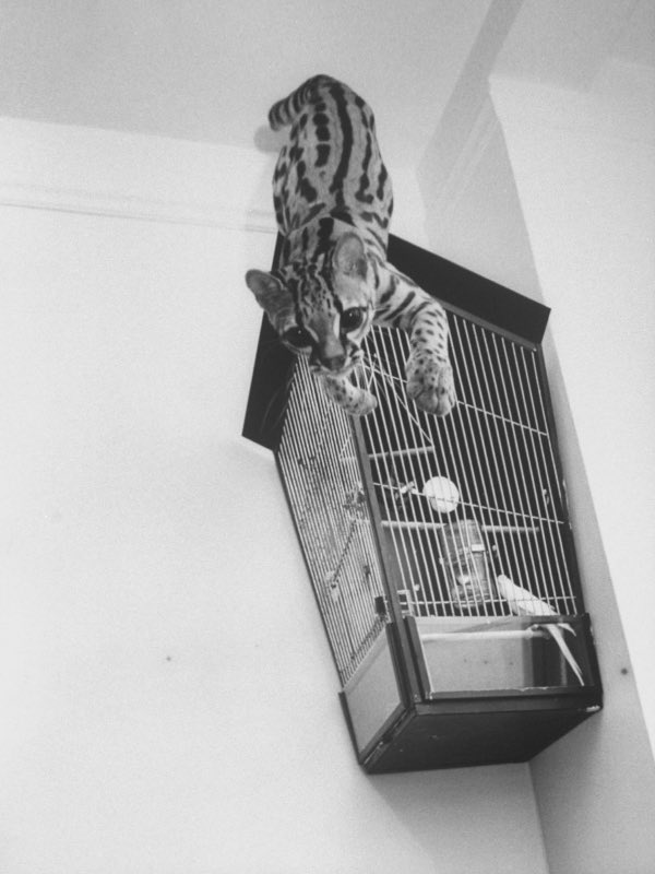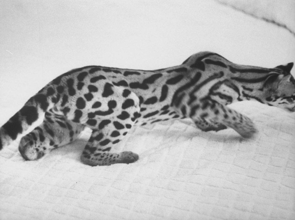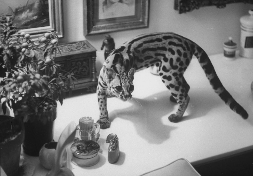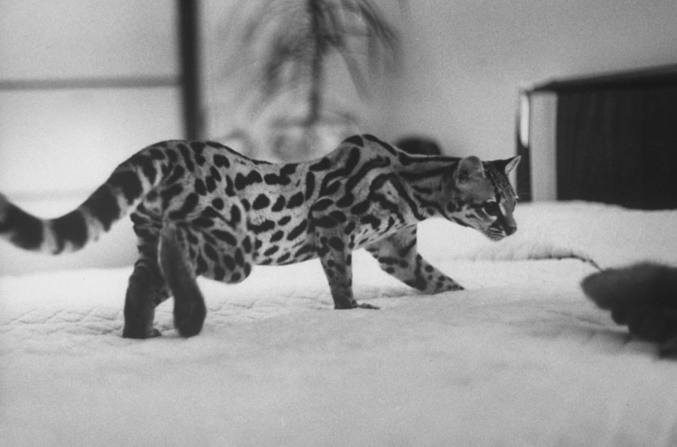 Photographer Al Fenn was commissioned to prepare a photo essay for LIFE magazine about life with an American (tree) leopard, a smaller version of the South American tabby cat, domesticated in the 1960s (1961) by a couple from Manhattan (New York), Si and Meg Merrill . Back then, exotic animals such as leopards, chimpanzees and even kangaroos were allowed and very popular as pets.