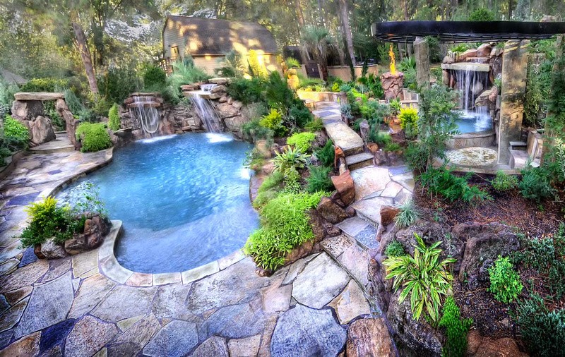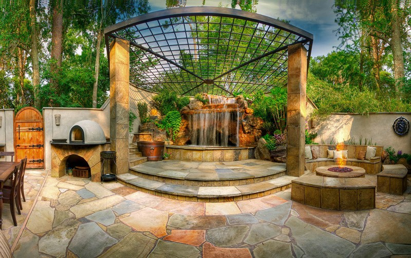 We present to you beautifully landscaped gardens adorned with artfully crafted pools, ponds, waterfalls, pillars, fireplaces, caves and outdoor kitchens.