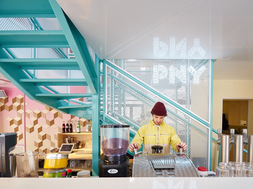 Interior French restaurants PNY, which can be found in one of the most beautiful areas of Paris, the Marais, has undergone a great transformation. Architects architectural bureau Cut Architectures refreshed the interior of the restaurant with a fresh color palette and space included pink steel pipes and mesh constructions, for the design of which inspiration was drawn from coastal huts found in the subtropical region, and inspiration was also taken from American fast food bistros. A subtropical touch the trendy restaurant is further emphasized by cacti, neon lights and reflective surfaces.