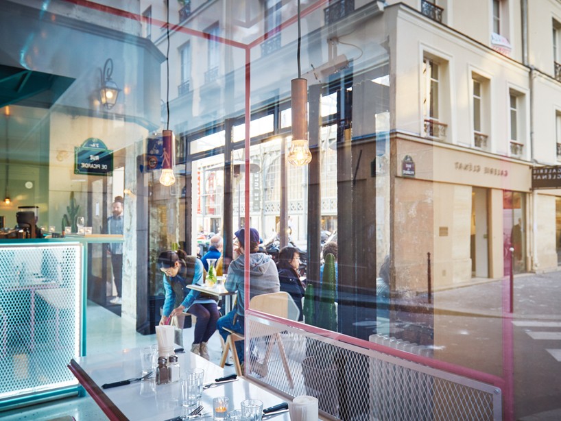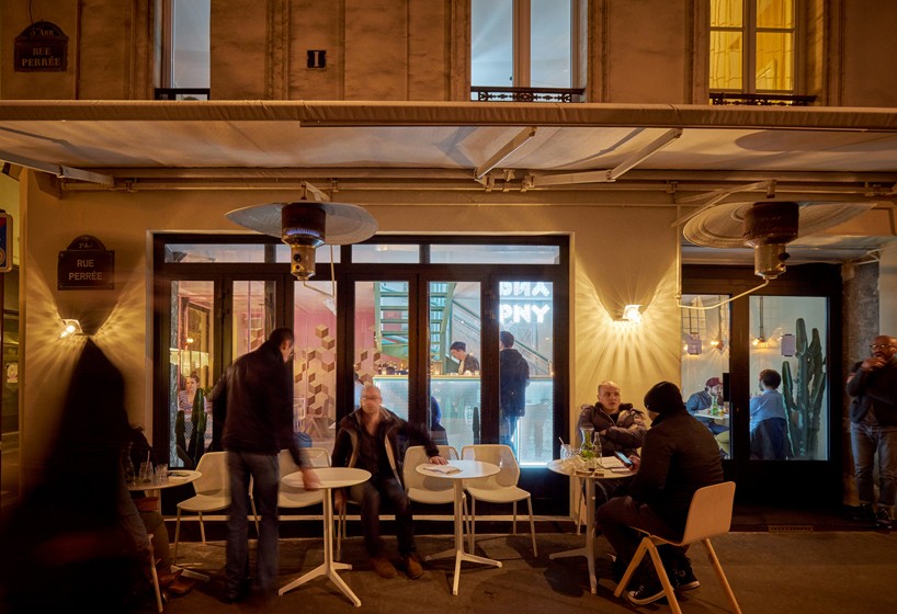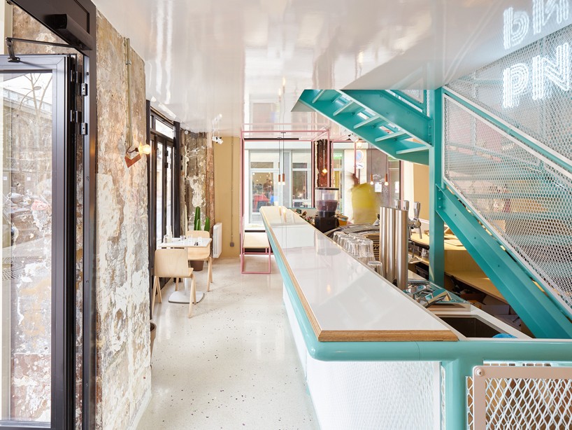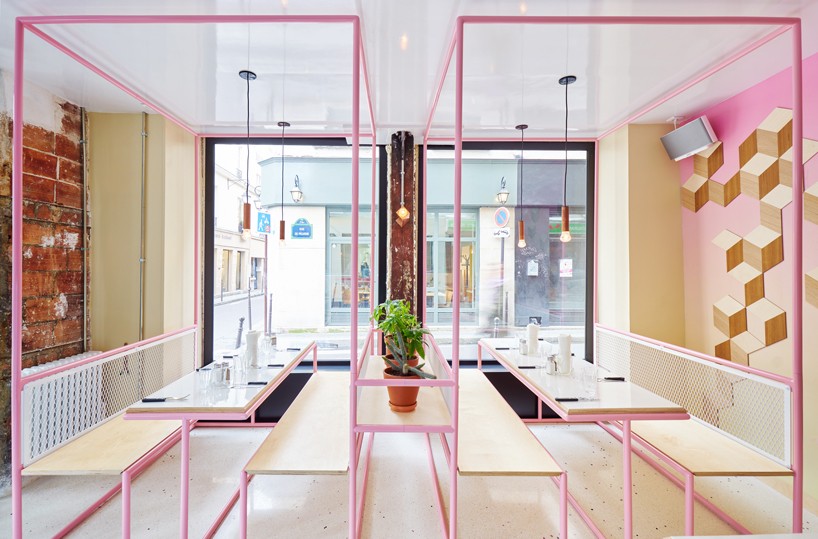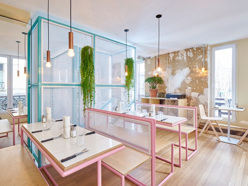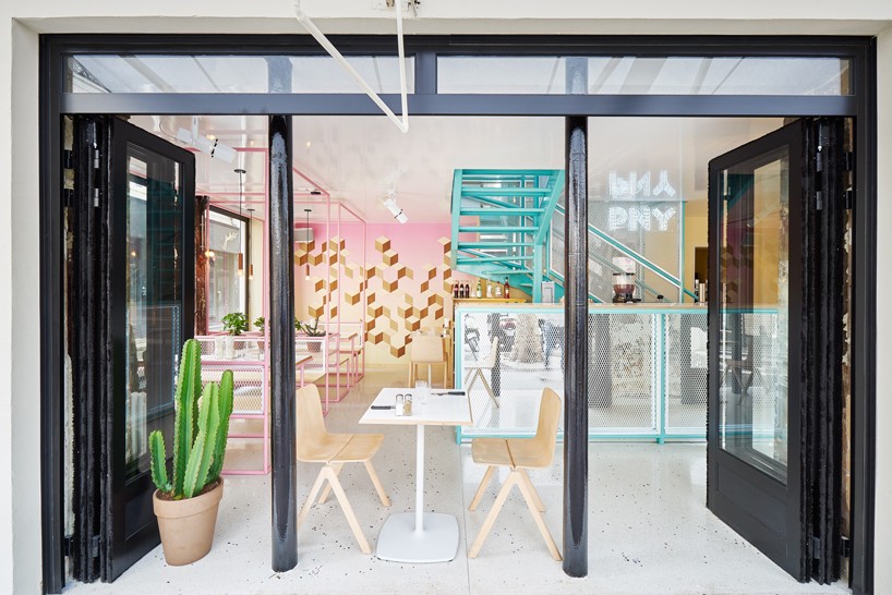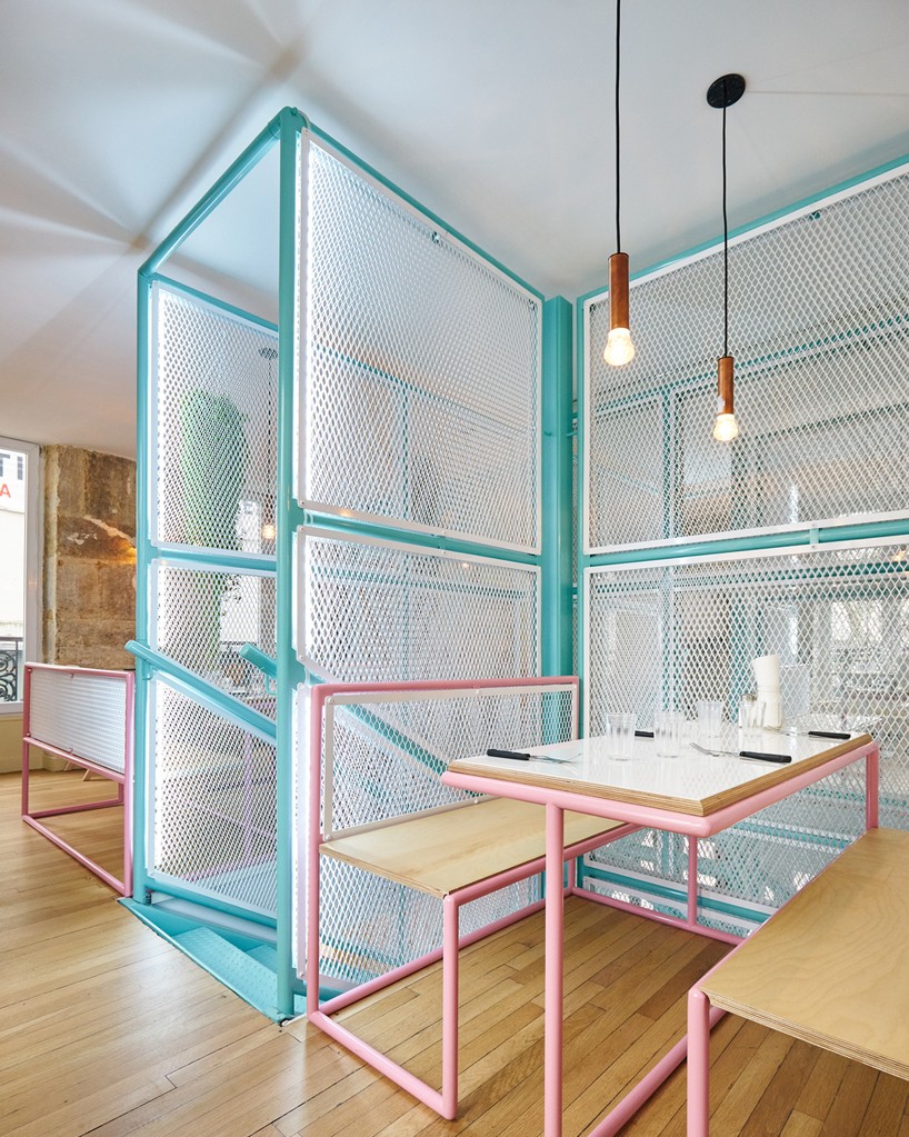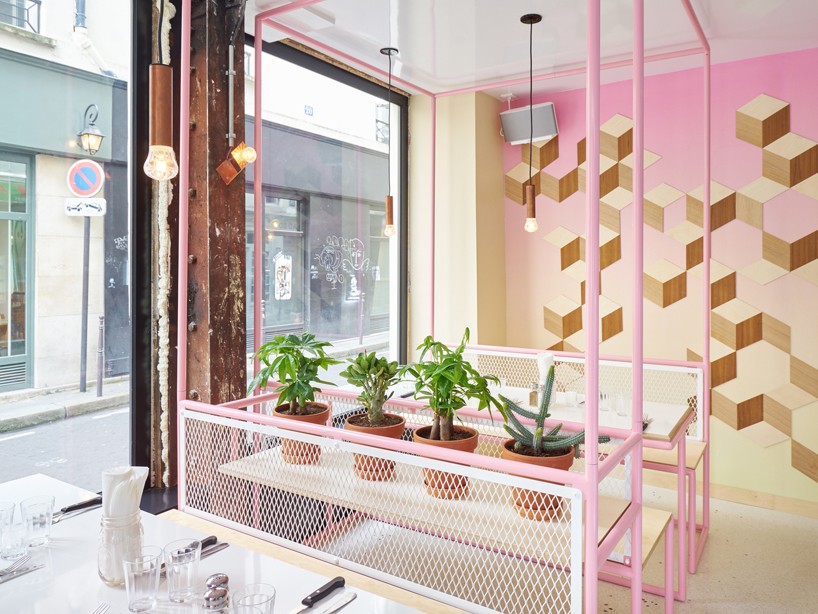 Interior French restaurants PNY, which can be found in one of the most beautiful areas of Paris, the Marais, has undergone a great transformation. Architects architectural bureau Cut Architectures refreshed the interior of the restaurant with a fresh color palette and space included pink steel pipes and mesh constructions, for the design of which inspiration was drawn from coastal huts found in the subtropical region, and inspiration was also taken from American fast food bistros. A subtropical touch the trendy restaurant is further emphasized by cacti, neon lights and reflective surfaces.