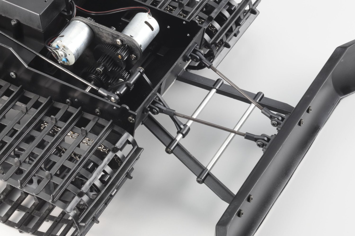 Although Kyosho Blizzard unable to clear large amounts of snow, it is plenty of fun to play in the snow. The vehicle has a solid chassis with protected important components against the ingress of snow and water, a movable front plow and two powerful engines. The snow tracks work independently and thus enable smooth turning in all directions and rotation in place. It is managed with the attached controller via a 2.4 GHz transmitter.