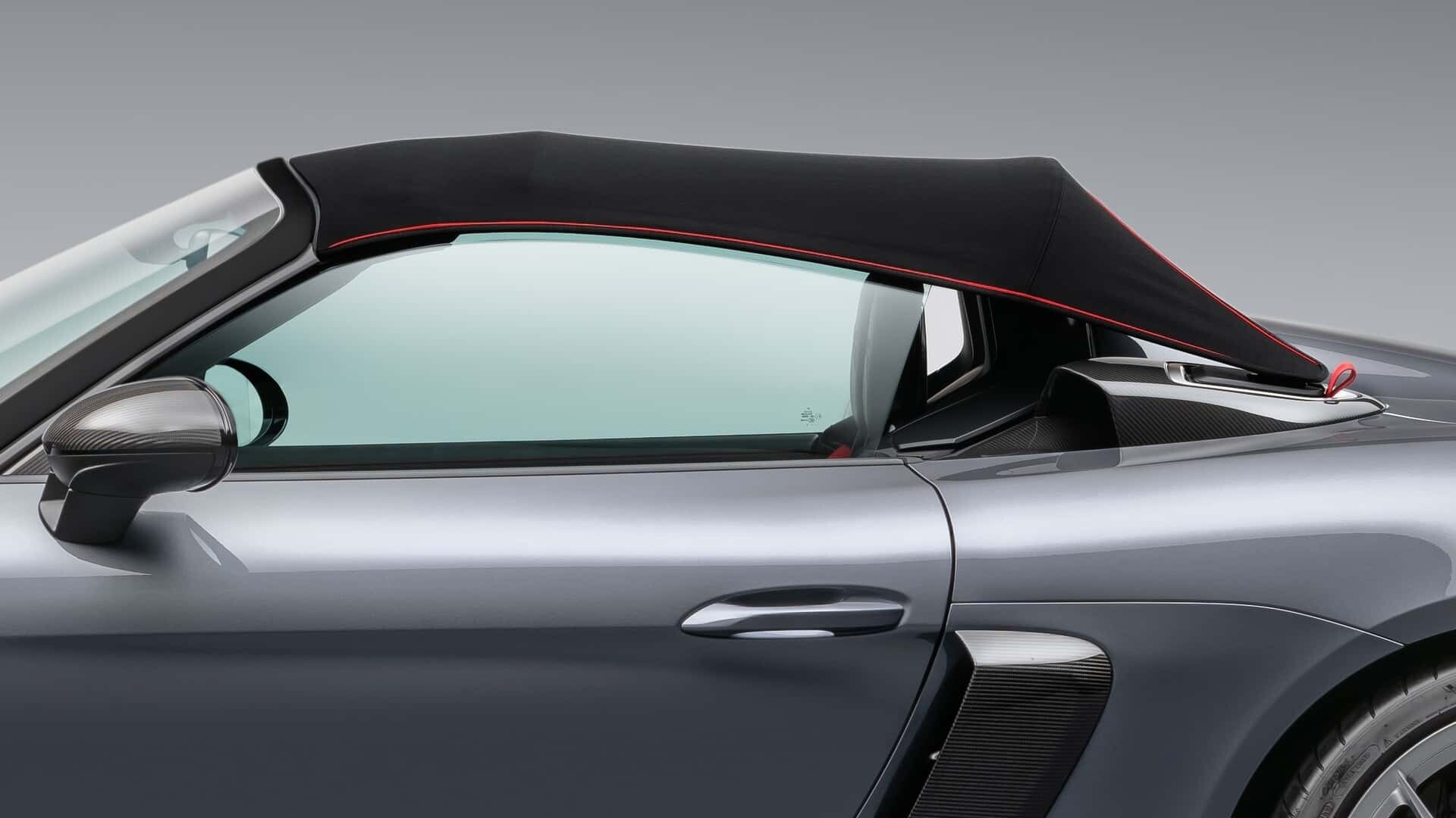 With weight only 1,410 kilograms (£3,108) 718 The Spyder RS sheds 40 kilograms (88 pounds) from the version that isn't RS. The convertible has a single-layer sun sail and wind deflector, making the roof assembly for 7.6 kilograms (16.7 pounds) lighter than 718 Spyder and 16.5 kilograms (36.3 pounds) lighter than the 718 Boxster.