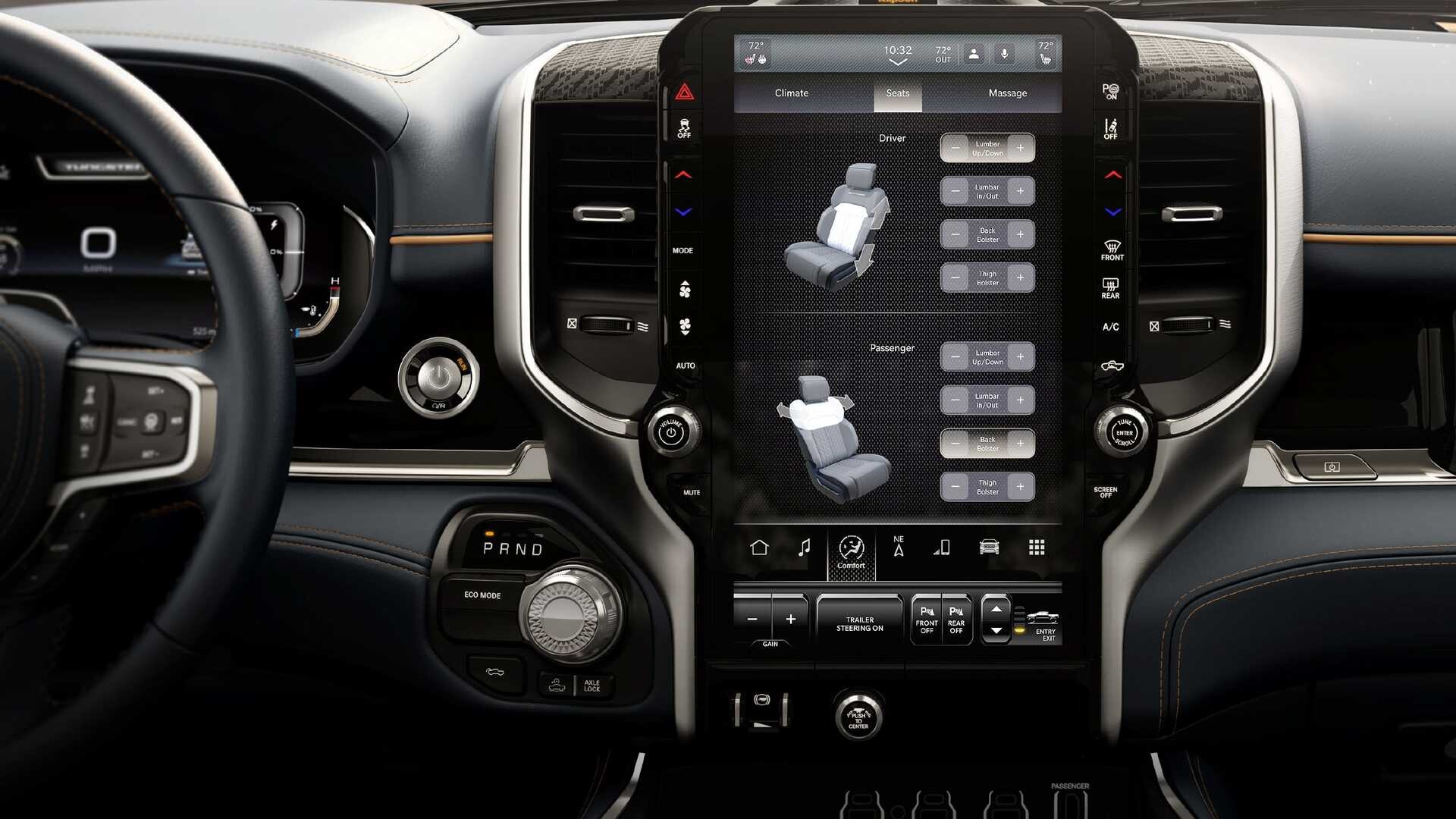 The cabin is equally stunning, with the top-of-the-line variant REV Tungsten offers premium leather seats, audio system Klipsch Reference Premiere with 23 speakers and three touch screens of 12, 14.5 and 10.25 inches for the driver and front passenger. Storage options include a power-opening trunk with 15 cubic feet of space and the RamBox, a lockable storage compartment with 115 volt outlet inside.