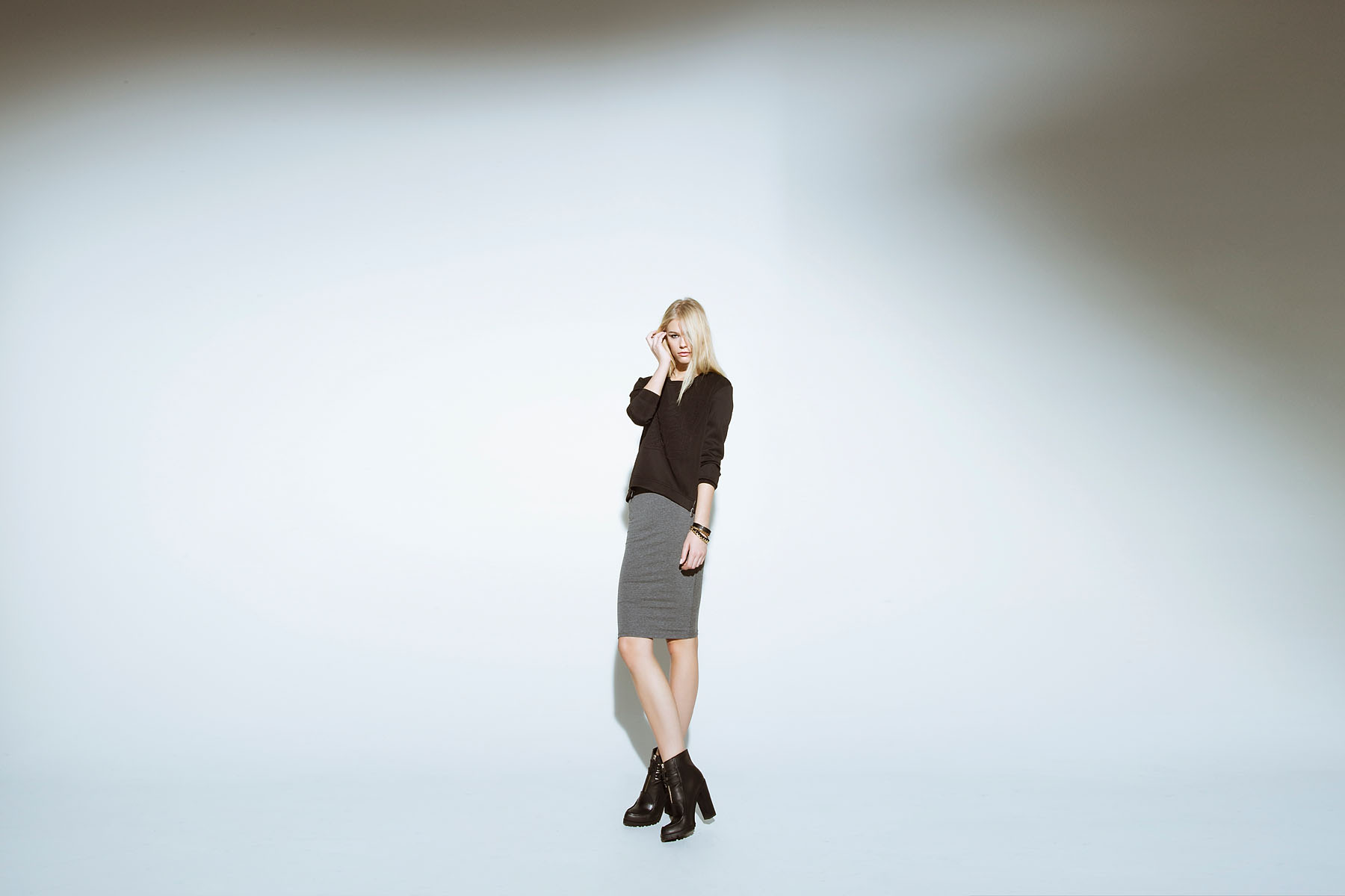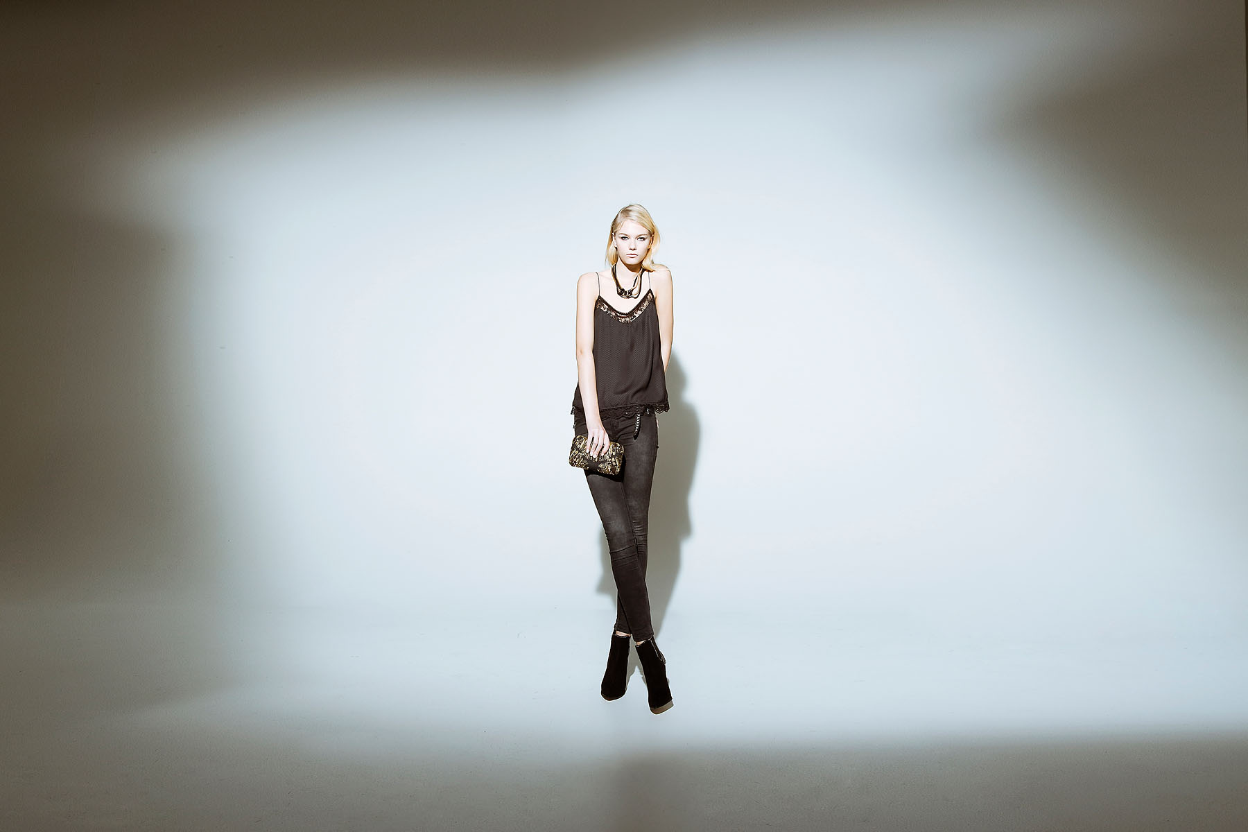 The styling of short, wide A-skirts with loose knits, wide check coats combined with tight pants in a pepita pattern offer bold ideas for pattern making. The collection from day to evening looks is rounded off with fashionable accessories in black and white and black and gold. There is also black lace, massive jewelry and biker ankle boots. In love!