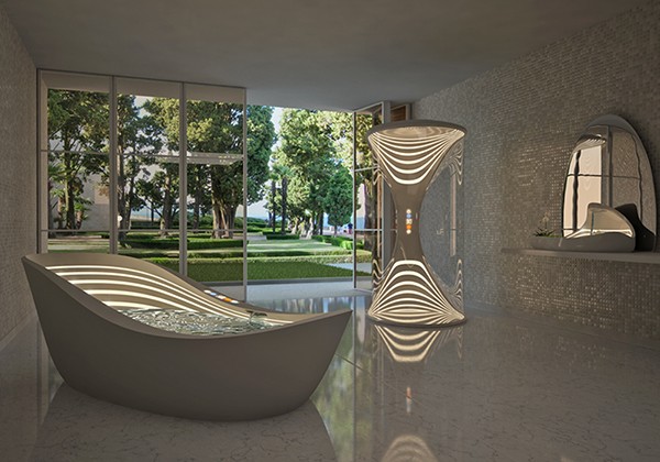 The collection consists of 3 elements: bathroom, shower and sink. Each element in smooth and organic shapes has integrated LED lights that create the effect of light diffusion through the translucent material. By adjusting the intensity and color of the light, you can treat yourself to pleasant chromotherapy. Another special feature of the sink is the built-in flower pots where you can plant your favorite plants.