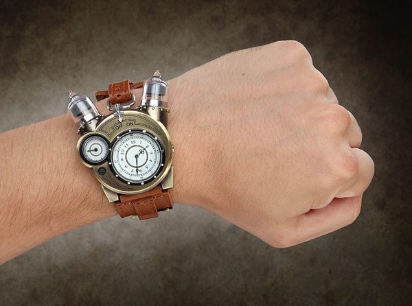 Tesla Watch it is neo-Victorian respectively retrofuturistic wristwatch which even the father of modern electricity would be proud of, Nikola Tesla, who was also her inspiration. The case gives the appearance aged brass and it resembles a piece you got at an antique shop and didn't order via the web. Besides leather strap it is decorated by two vacuum tubes (electrons) with an LED bulb, which can be turned on with a special switch.