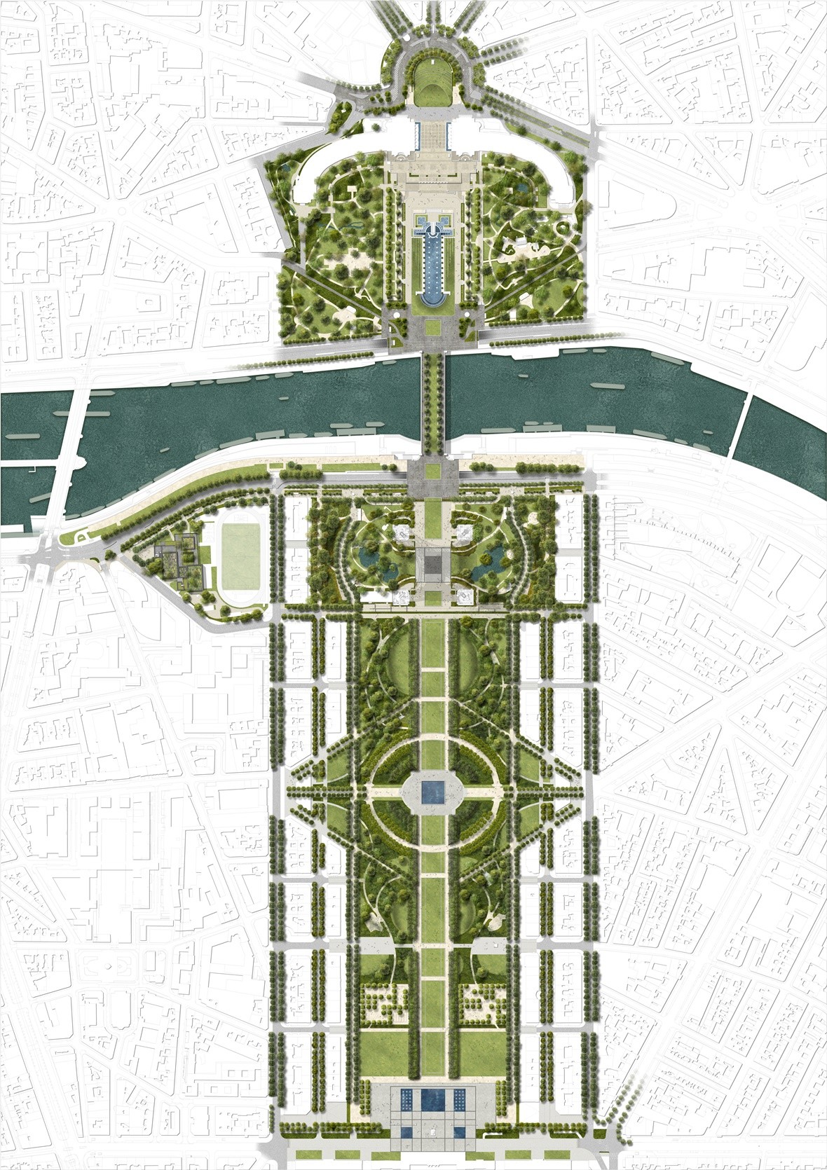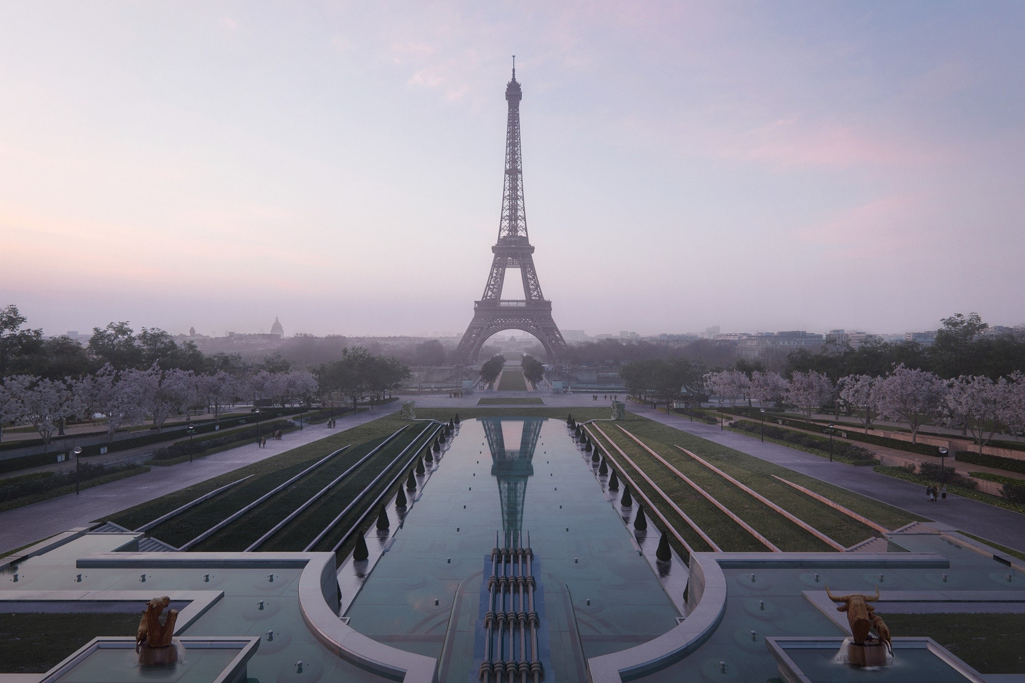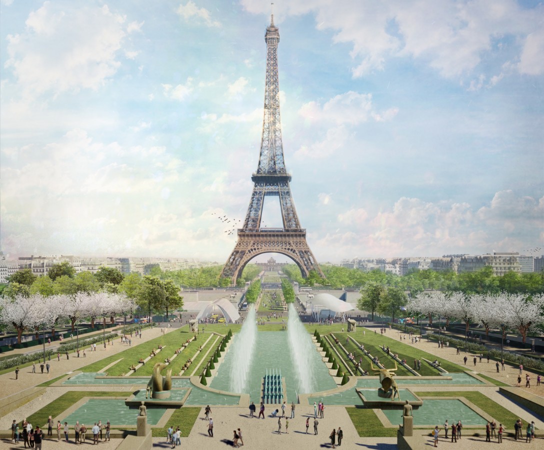 Landscape architects from an English company proved to be the best Gustafson Porter + Bowman – their winning concept puts the Eiffel Tower in the center axes, which connects the Trocadero square, Chaillot Palace, the Pont d'Iéna bridge, the Champ de Mars park and military academy Ecole Militaire. It spreads over it belt of classic French gardens accompanied greens of all kinds. The renovated public space is located between the Warsaw fountains and the aforementioned bridge.