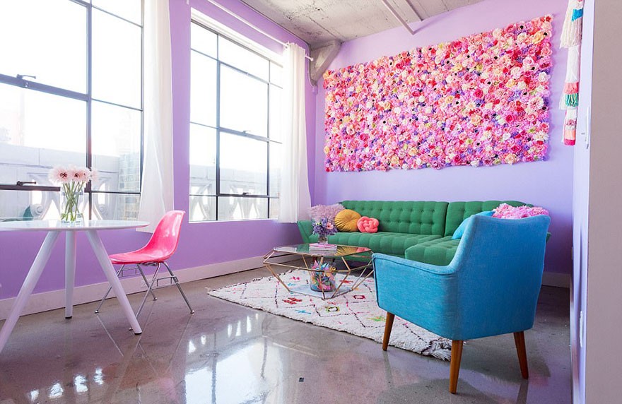 Purple walls, pastel cabinets, flowers on the wall, Hello Kitty microwave oven, colorful paper cranes hanging from the ceiling - all this can be found in the apartment Amine Mucciolo. "It is very important that the apartment reflects me and my personality, as well as my husband's personality," adds Amina. "We want our apartment to be fun, happy and inspiring." She also knits several times herself rainbow whales, dresses up in colorful clothes and opts for make-up with glitter.