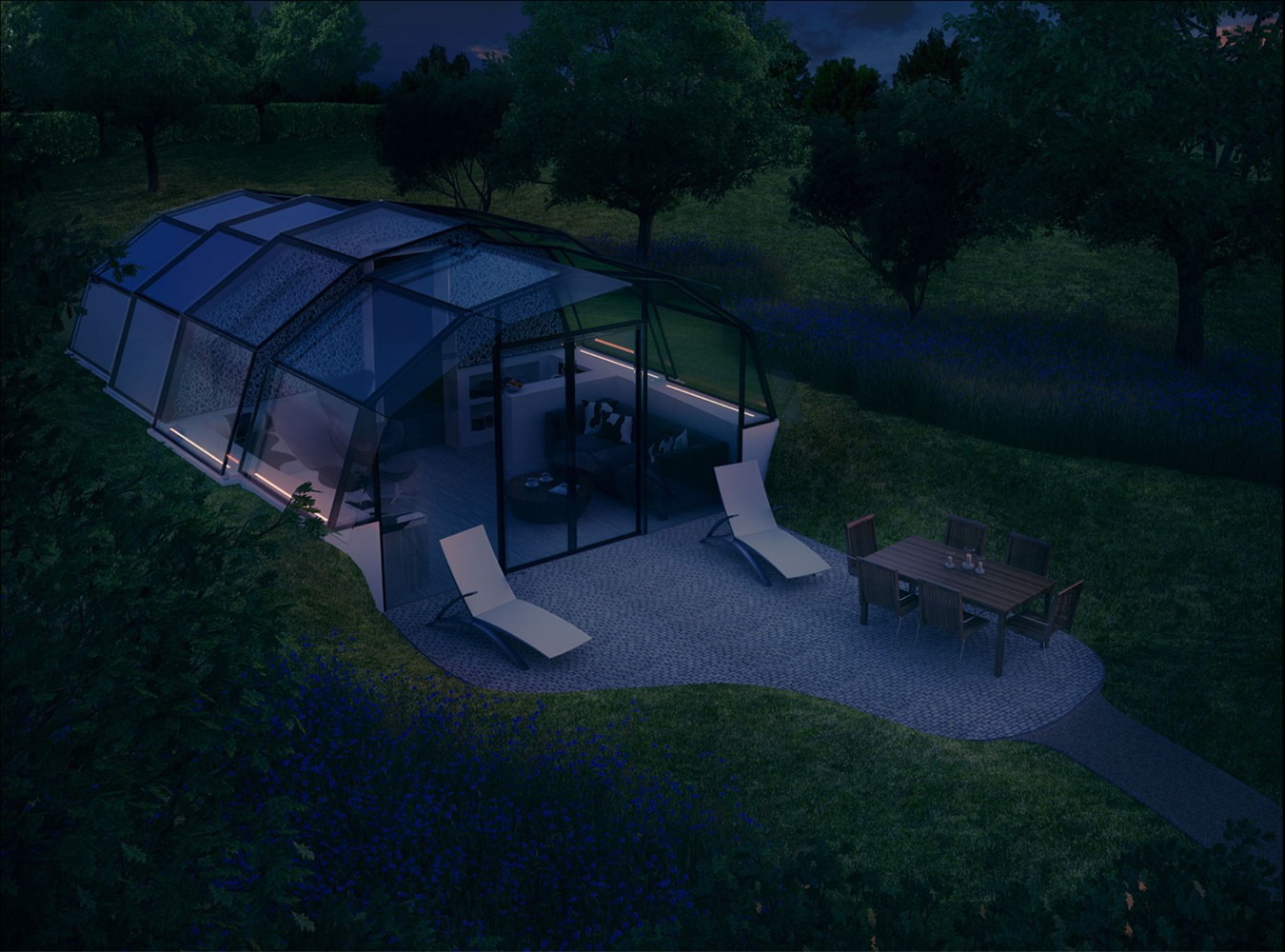 The Photon Space is designed so that you can switch from completely transparent glass to frosted glass via the smartphone app. This is not only for privacy, but also for better sleeping conditions and treatment of stress, including anxiety, seasonal affective disorder, maintaining energy and libido health. If desired, we can add an additional layer of glass for greater privacy.