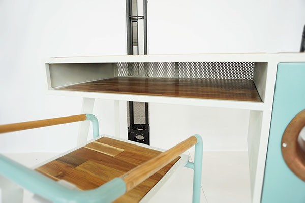 Work table The Soundbox Desk features a modern, vintage-inspired design. Acacia wood, steel and copper are excellently complemented by white, mint and natural wood color. The retro look certainly meets all the needs of the modern urban soul who strives for high efficiency and a pleasant appearance. The table is not only beautiful to look at, but it hides a very special secret. It has a built-in low-tech amplifier, which looks more like an antique horn of a record player than a modern speaker, which you simply connect to your smartphone, which it basically is.