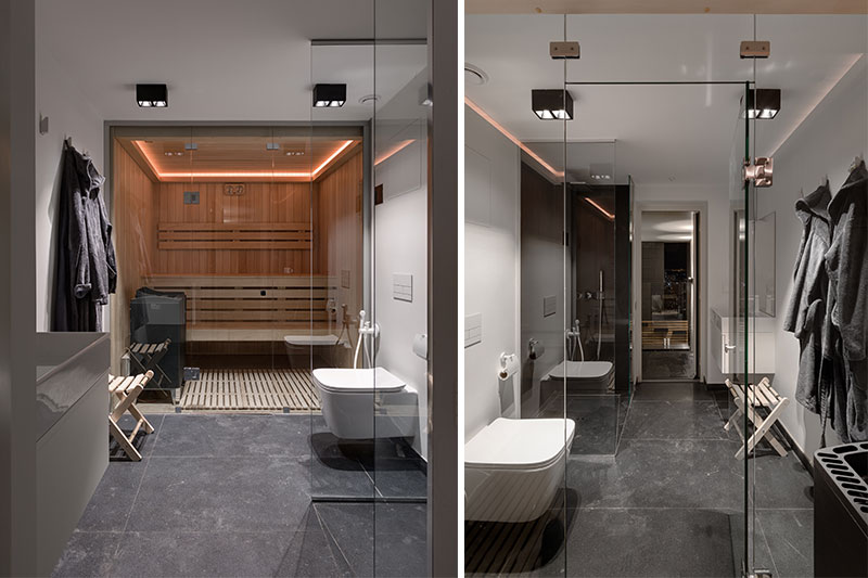 The overall concept of the team was to provide a maximally open and clean interior. The apartment consists of two levels, and there is a living terrace at the top. On the first floor are the sleeping areas: the master bedroom and the children's room, separated by a smart glass partition, and a hallway. On the second floor, there is a space for socializing and gathering, with a fireplace that provides a warm and pleasant contrast to the otherwise austere whiteness. There is also a kitchen on this floor, which is equipped with a food elevator for added convenience. On the terrace there is a living room with a swimming pool, a sauna and a kitchen with a barbecue!