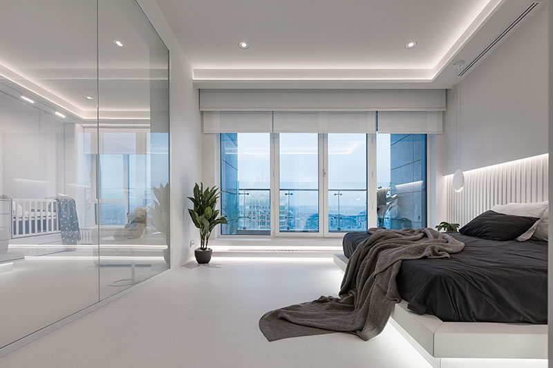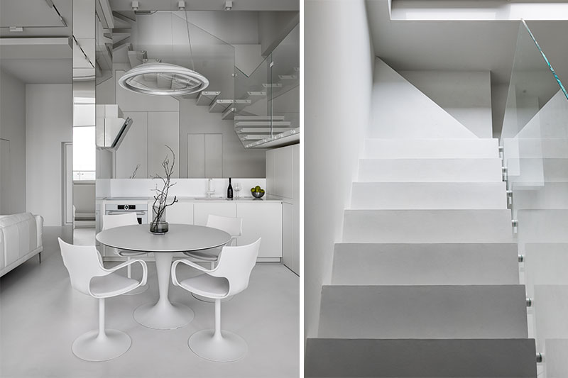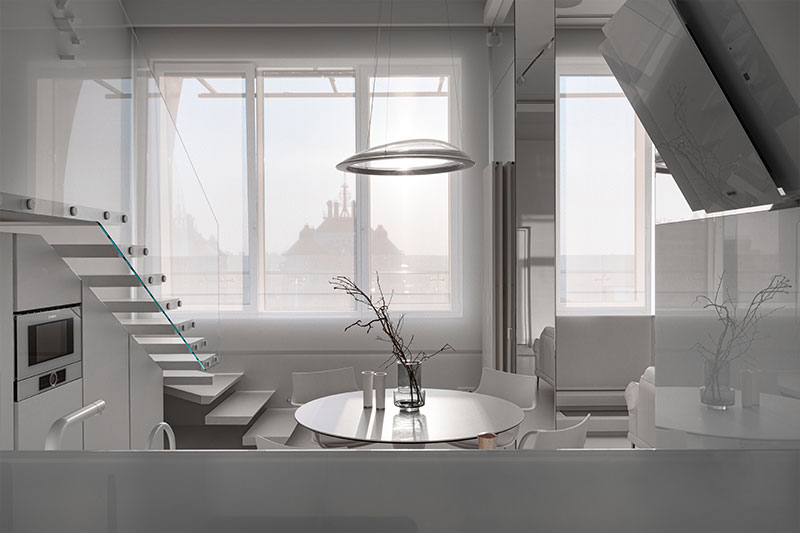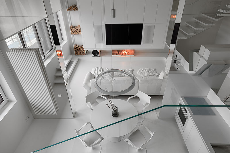 The overall concept of the team was to provide a maximally open and clean interior. The apartment consists of two levels, and there is a living terrace at the top. On the first floor are the sleeping areas: the master bedroom and the children's room, separated by a smart glass partition, and a hallway. On the second floor, there is a space for socializing and gathering, with a fireplace that provides a warm and pleasant contrast to the otherwise austere whiteness. There is also a kitchen on this floor, which is equipped with a food elevator for added convenience. On the terrace there is a living room with a swimming pool, a sauna and a kitchen with a barbecue!