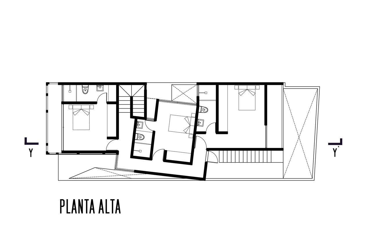 On the ground floor of the building, from the street towards the interior of the building, the garage, entrance hall, living room and dining room follow each other in terms of privacy. Next comes the kitchen and the parents' bedroom, which open onto the inner courtyard. The facade of the ground floor is uninteresting and merely reflective function of protecting the interior of the building. On the other hand, the upper floor of the building is dedicated to children's rooms, is completely private and has an interestingly treated facade.
