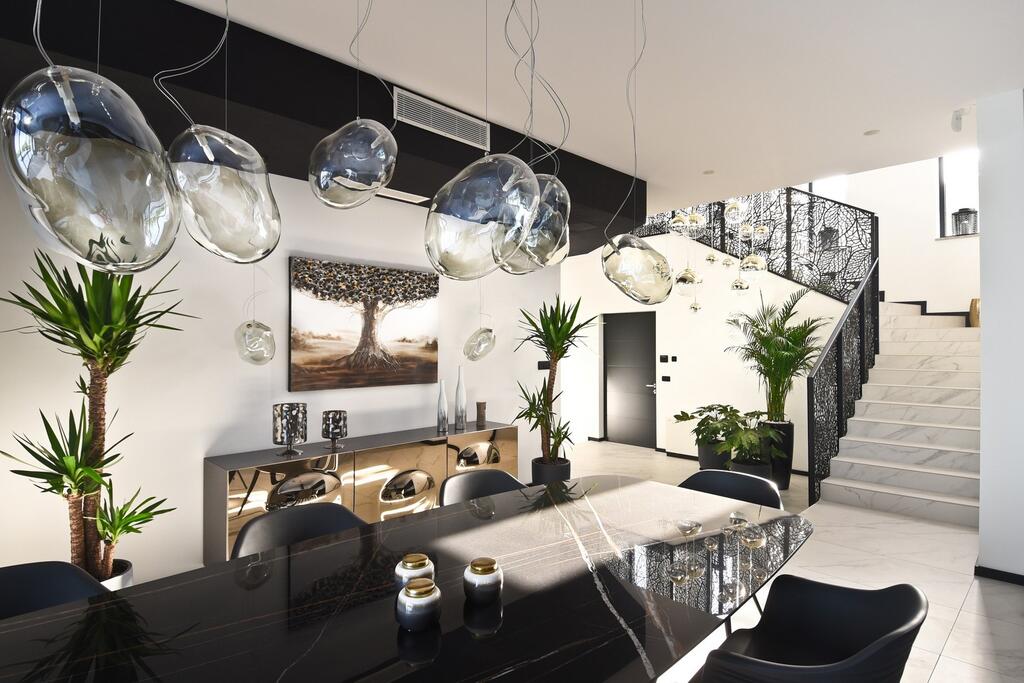 The interior of the villa is modernly arranged, you have four bedrooms, each with its own dressing room and bathroom, a fully equipped modern kitchen, a spacious dining area and a romantic fireplace, so this villa is also an excellent choice for a winter break. You can enjoy breathtaking views from inside the villa, as this one has large panoramic windows. It's in the basement spa corner with indoor heated pool and sauna. They are also at your disposal gymsand so on billiards room, where you can have fun with your family or friends.
