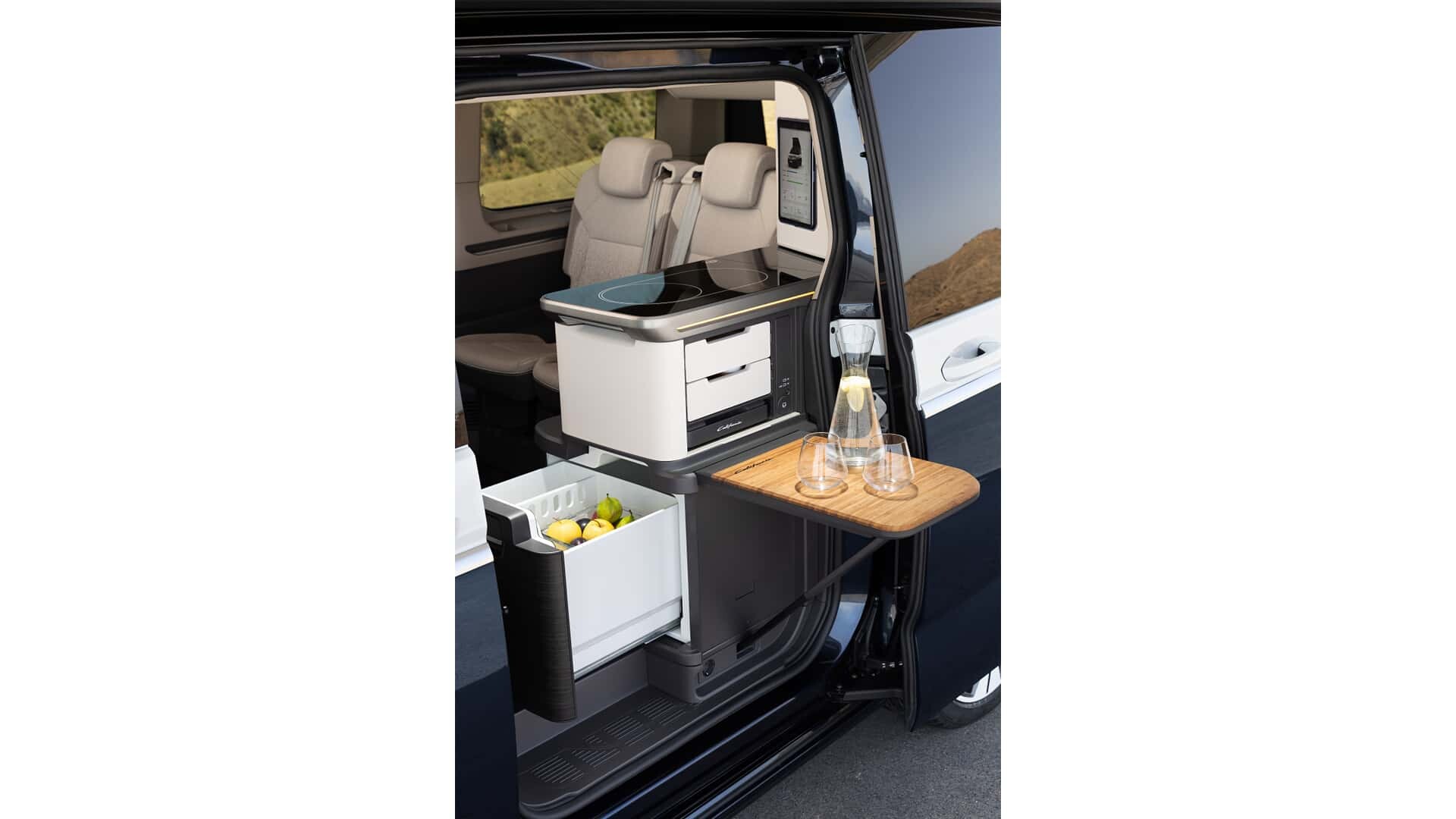 And now to the point: door. Remember the days when having one sliding door was the height of automotive luxury? Well, VW has set new standards. Introducing the second sliding door on the left side of your favorite RV! The kitchen, which was previously wedged to one side, is now moved slightly back, allowing for passage. The result? Your induction hob, sink, fridge and drawers are now within easy reach, accessible from both inside and outside. And yes, there is also a gas cooker and 230 volt outlet outside.
