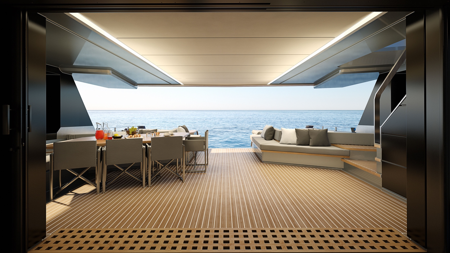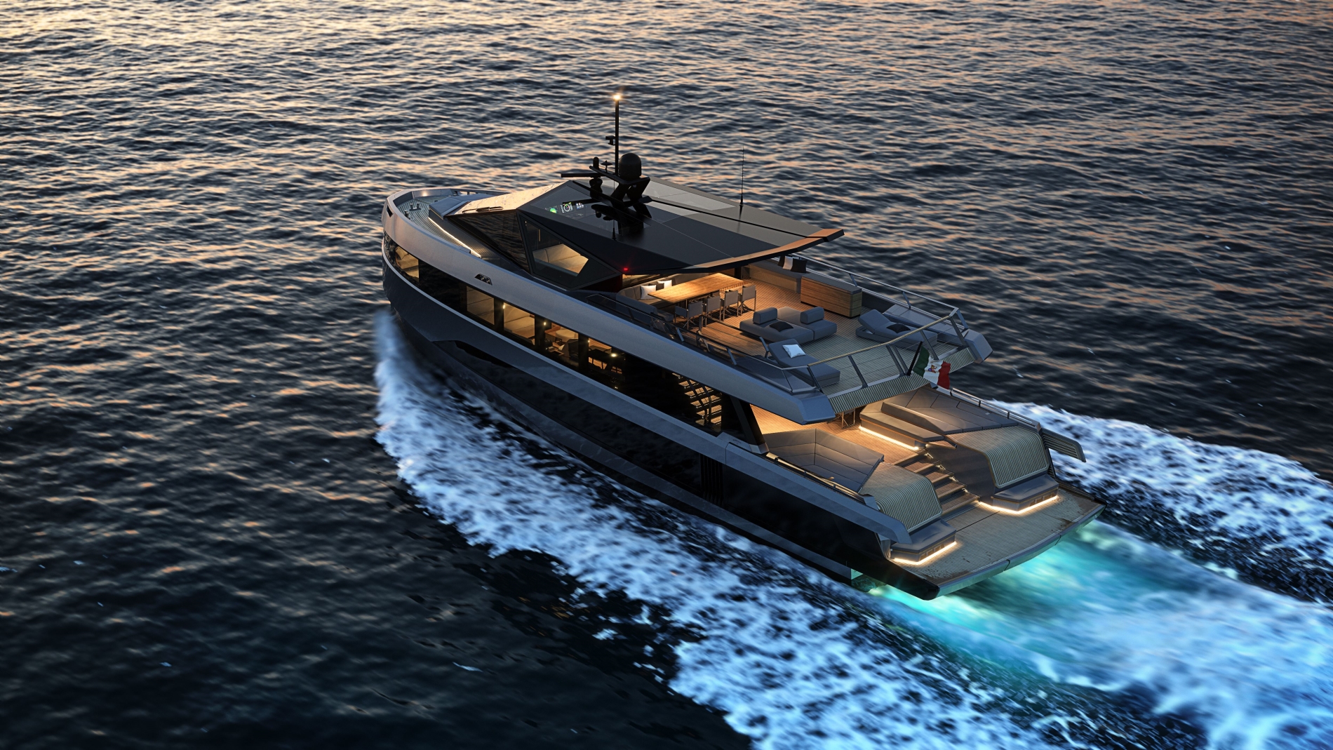 The most luxurious space is hidden in the bow and is, of course, the owner's suite. Only this one is surrounded by windows on all sides and offers a panoramic view of the vast sea. Folding deck sections are installed at the stern, offering additional space for enjoying the sun and recreation. There are two large garages in the bow of the yacht, which offer enough space for a bunch of water ʺplayersʺ. Four powerful Volvo engines take care of the drive 588 or 735 kW, who propel the yacht all the way to 23 knots. Fuel tanks, in common size 12,000 liters and a water reservoir in size 2,200 liters, allow up to 390 nautical miles reach and enjoy the luxury of a prestigious yacht.