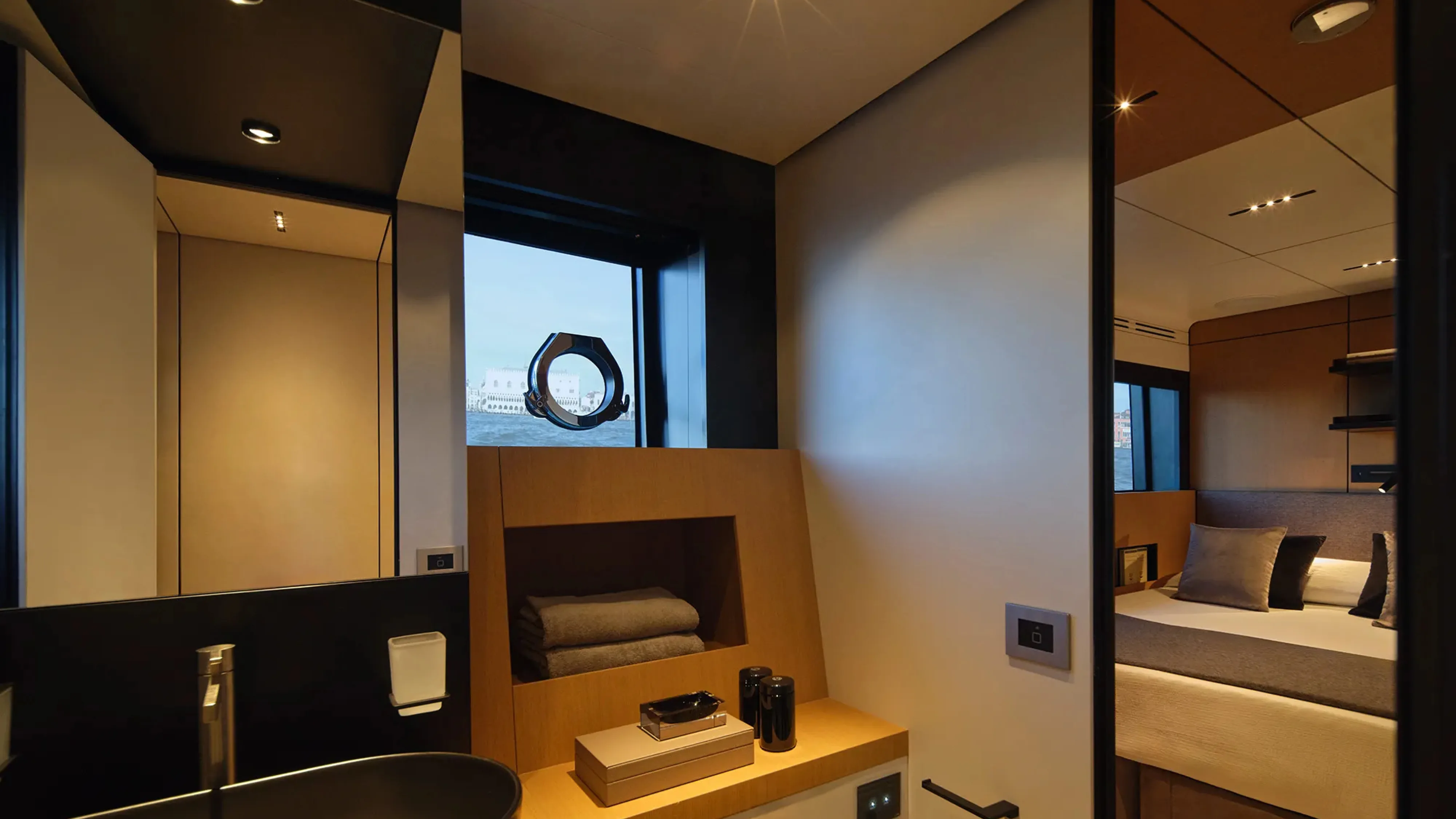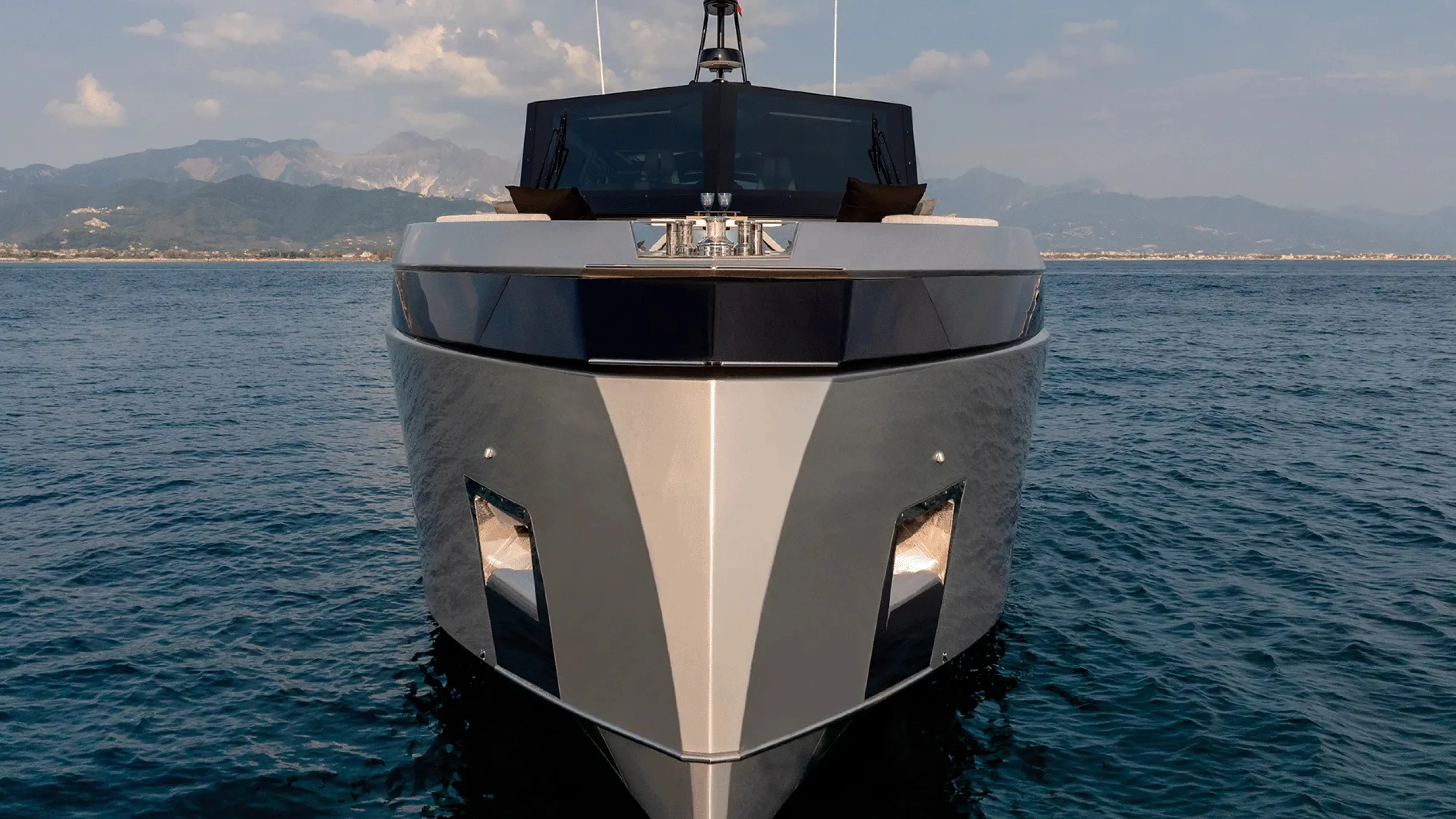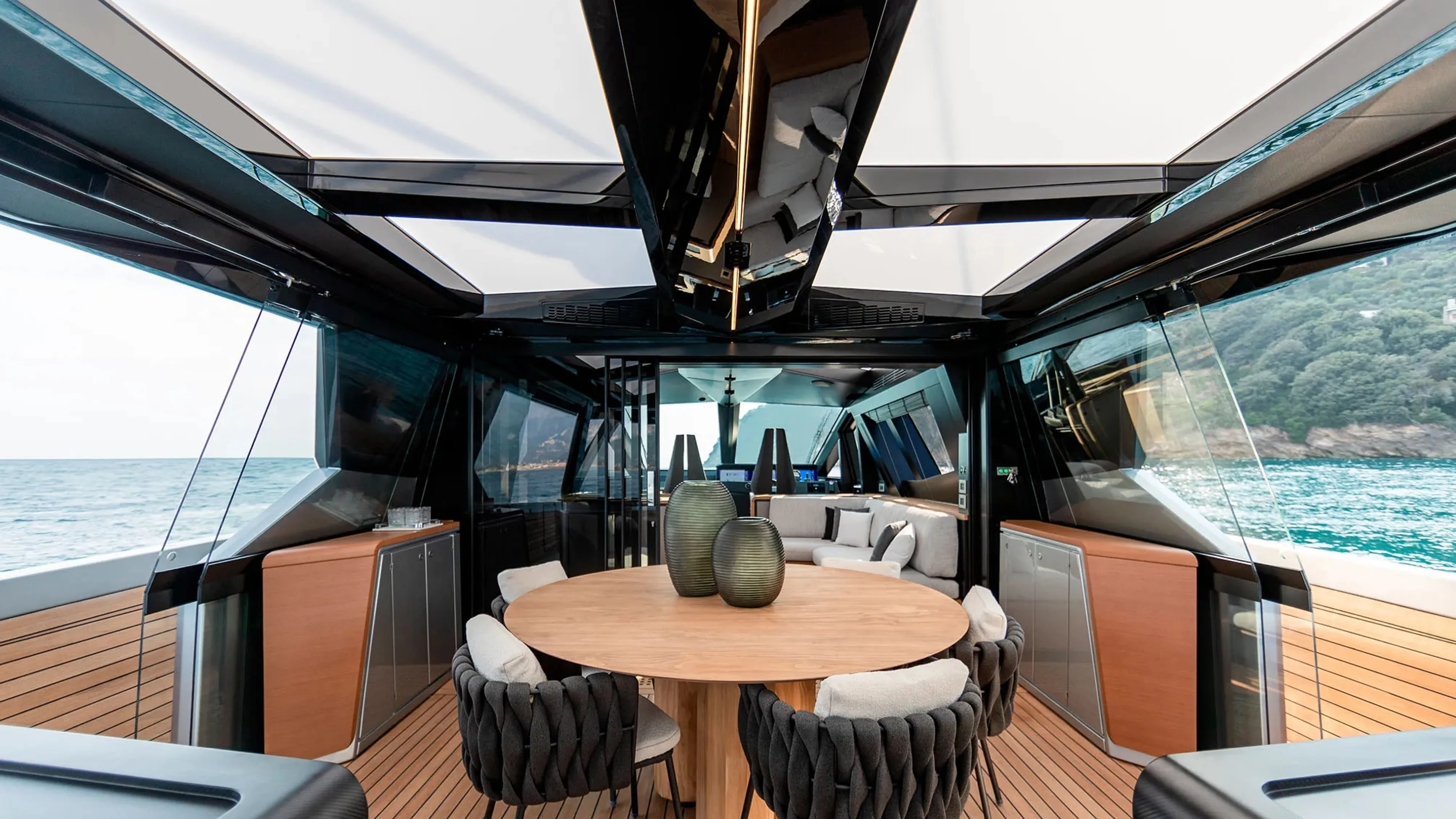 Its futuristic silhouette and huge glass surfaces create the feeling of sailing on a movie set. The interior salon and bridge can be completely closed off with elegant glass doors – or everything can be opened up to let the wind of freedom blow into the yacht. The outdoor dining area with an elegant round table for six people is a real stage for parties under the stars.