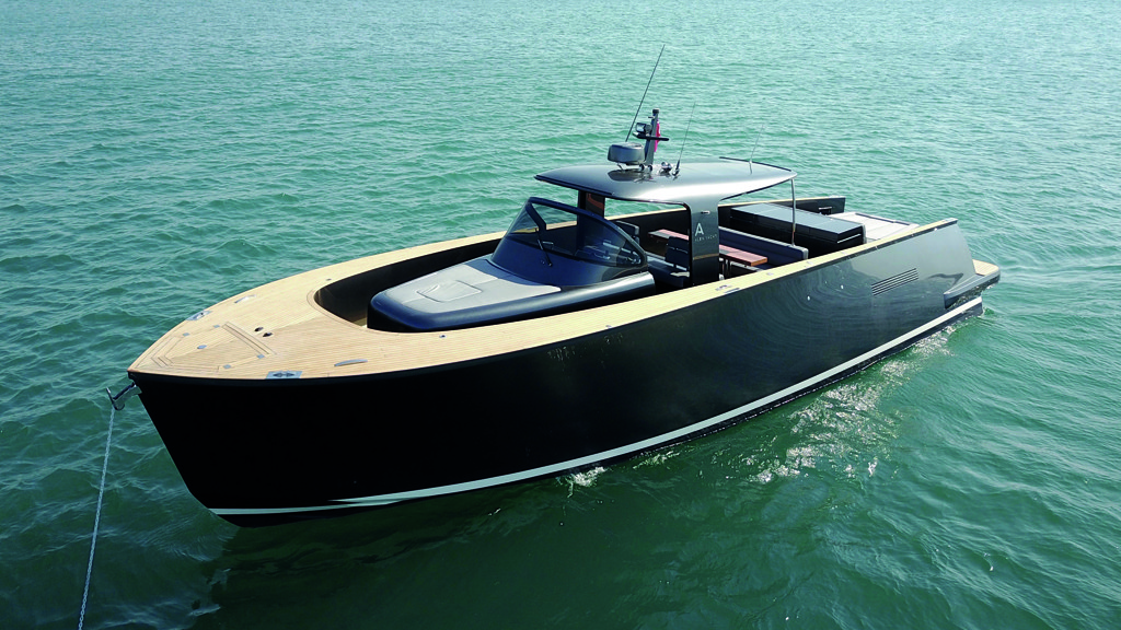The front of the yacht rises steeply out of the water and looks quite high out of it. As a result, it is also easier to deal with bigger waves and is thus faster even in worse sailing conditions. The hull has a high V-shape, and around the bow is wooden edge, which acts as a kind of narrow walkway. The cabin is not overly large and is also in minimalist style, but there is still enough space for a comfortable bedroom and a large enough bathroom. At the time of purchase, the future owner can make up his mind any body color, and all other surfaces are available from any wood. Two take care of the drive engine Volvo IPS 600, and with their help the yacht reaches maximum speed 38 of knots. There is enough fuel on board for 300 nautical miles.