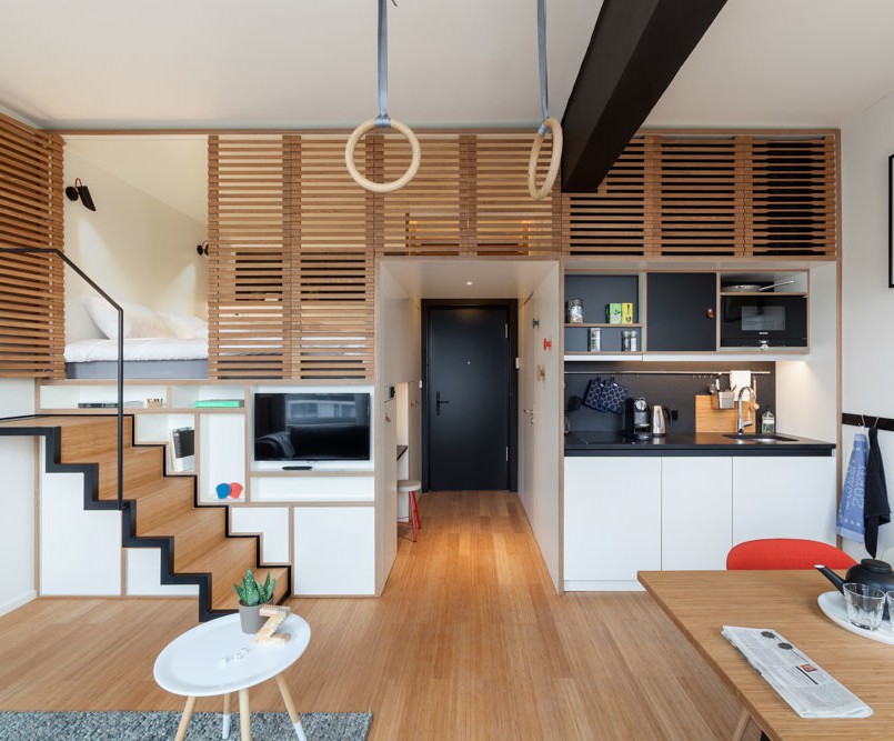 The key point of the room is not the bed, but a modern and fully equipped kitchen and a cozy work corner. You can reach the bed by sliding stairs, the bamboo floor gives you a feeling of warmth, the artwork on the walls can be arranged as you like. The common areas look like a living room, the dining room like a perfectly equipped home kitchen. Prices in the hotel start from 110 euros per night, and rooms can also be rented for a longer period of time.