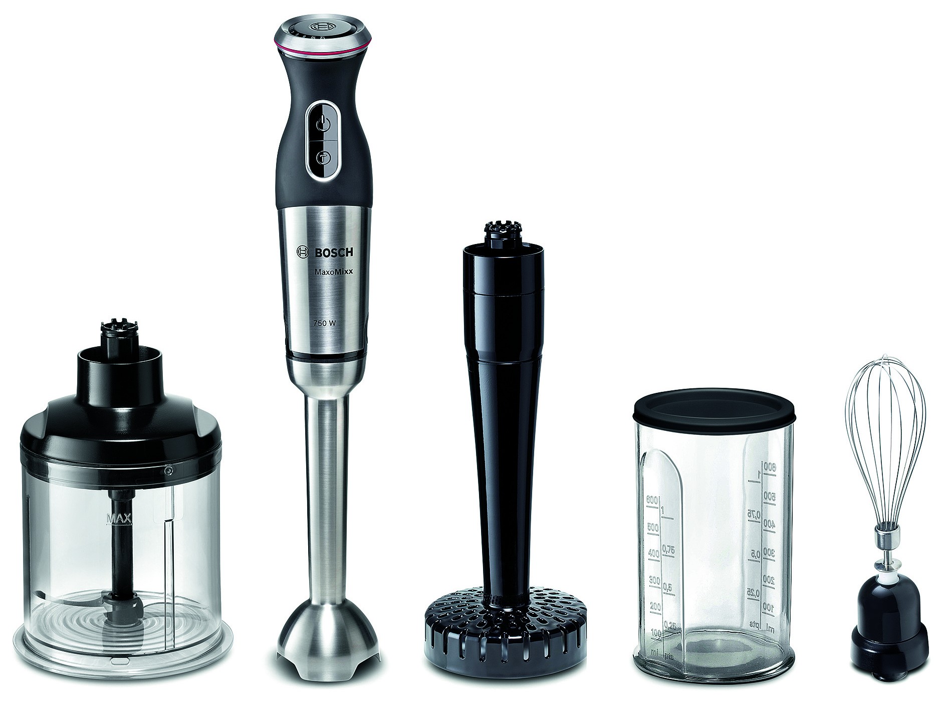 Boschev palični mešalnik MaxoMixx ni zgolj palični mešalnik, temveč pravi kuharski mojster, ki obvladuje vse procese v naši kuhinji. Zmogljivemu in kakovostnemu ohišju ter mešalni nogi iz nerjavečega jekla je priložena tudi široka paleta pribora, ki še dodatno navduši in izboljša njegovo vsestranskost in multifunkcionalnost. Nastavek za pasiranje ProPuree, metlica za stepanje, univerzalni sekljalnik, mešalni lonček z merilno skalo in pokrovom nas bodo naravnost prevzeli. S 750 W močnim motorjem, 12 stopnjami hitrosti, turbo gumbom in posebnim nožem s kar štirimi rezili QuattroBlade je Boschev palični mešalnik MaxoMixx tako močen, da je kos vsem izzivom.