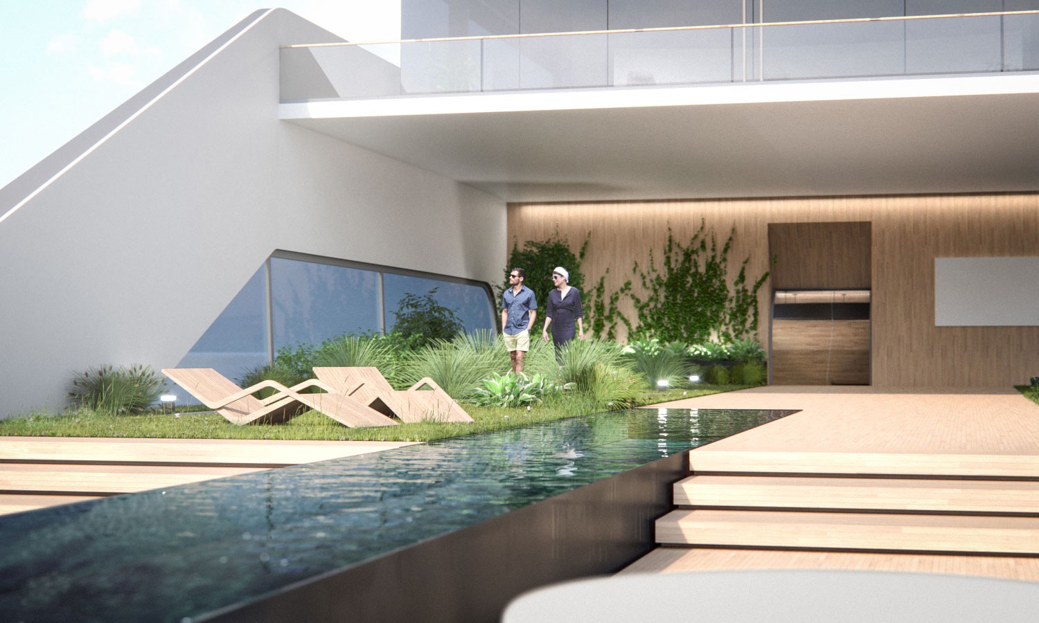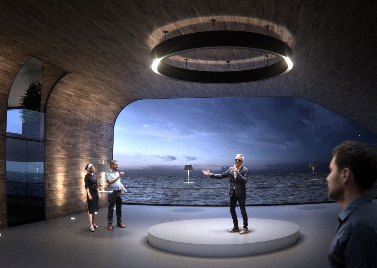 Por lo tanto, la mayor parte del barco ofrece vistas panorámicas, que en la mayoría de las competiciones se limitan a una sola parte del barco. Dado que quiere acercar al hombre a la naturaleza, no es de extrañar que también pueda presumir con un jardín, pero no se deja ni un solo hilo Piscina de 20 metros de "un carril". La última parte está diseñada como la costa (el terreno se eleva gradualmente) para que el mar pueda chocar suavemente contra el barco. también se jacta paneles solares, que ocupan hasta 300 metros cuadrados de superficie y están conectados a una batería de iones de litio que permite navegar a baja velocidad sin consumo de combustible.
