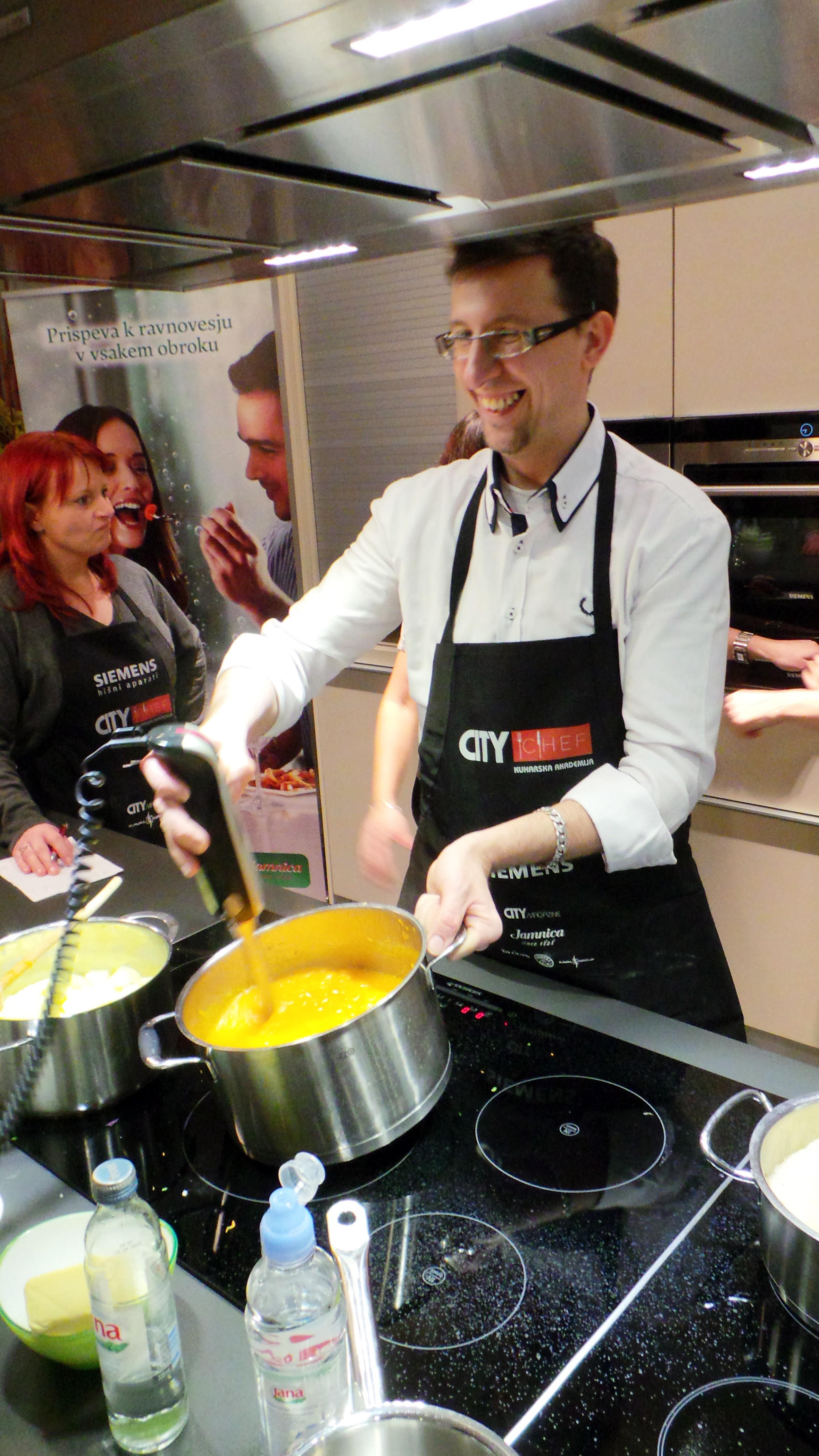 Bajo la atenta mirada del chef Dragan Marjanoviča del restaurante Kaval preparamos delicias de carnaval como sopa de calabaza, lengua de ternera sobre un lecho de achicoria y, como plato principal, cerdo rebozado con pescado y puré de patatas con col. maestro pastelero Greg Roda de una pastelería Lolita pero él nos enseñó a preparar postres de carnaval. Un enólogo también se presentó durante la academia. Blazic.