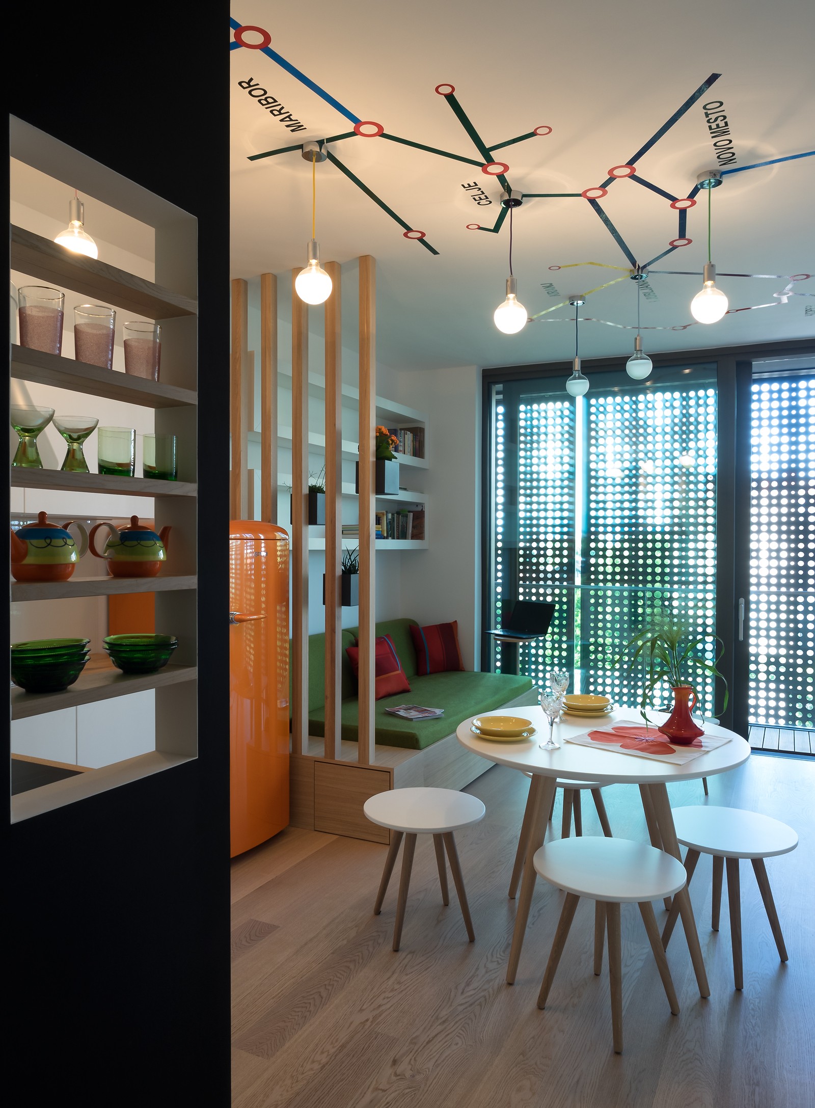 La superficie habitable del apartamento es bastante pequeña, por lo que no querían cargarla con muebles pesados. En cambio, el juego de cocina y sofá se presionaron contra la pared, y solo se colocaron en la habitación la mesa de comedor y las sillas, que, debido a su forma redonda, tienen un efecto suave y discreto. El espacio parece brillante, acentos coloridos y agregan frescura y alegría. Todos los accesorios textiles decorativos son obra de la diseñadora Vesna Javornik. El principal atractivo de la sala, sin embargo, es sin duda la estampa del techo, que indica la posición geográfica del complejo Situla y marca las principales conexiones ferroviarias del país y las principales ciudades. Este gráfico da a los visitantes una idea general del espacio de nuestro país y facilita su orientación inicial. El apartamento también cuenta balcón grande, en el que los visitantes pueden relajarse y disfrutar de la vista.