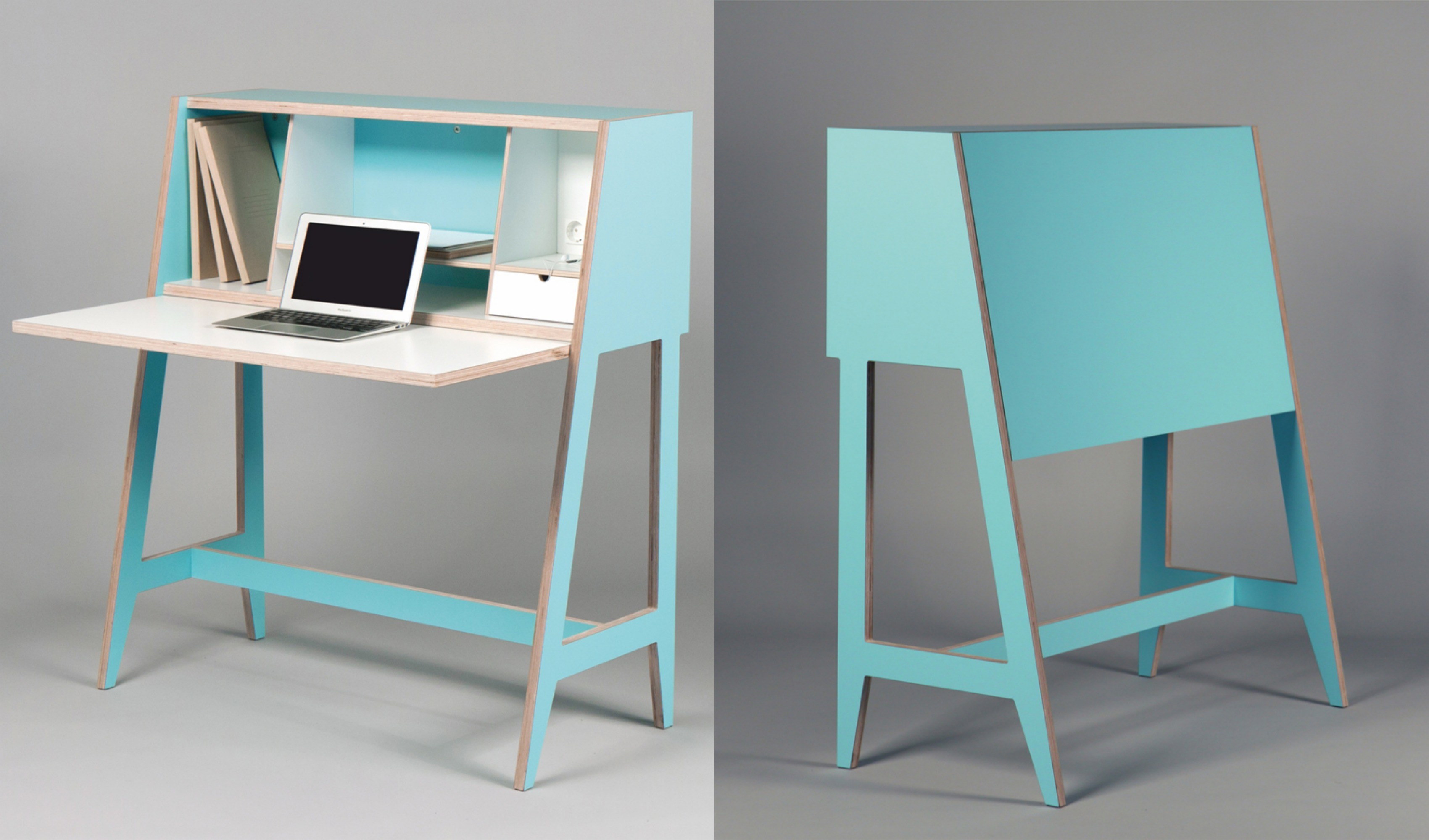 A primera vista, la mesa de trabajo de diseño minimalista en un hermoso color menta parece bastante modesta. De hecho, cuando lo miramos, pensamos en un mueble que sería adecuado para el almacenamiento más que cualquier otra cosa. Pero cuando se abre la puerta del gabinete milagroso, aparece ante nosotros un mundo completamente diferente, un interior extremadamente emocionante.