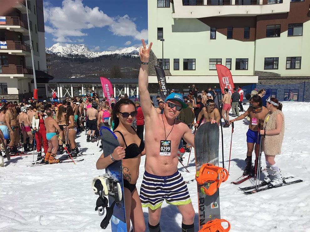 Al final de la temporada invernal las temperaturas ya eran tan altas que realmente se podía esquiar o surfeado en traje de baño. Bueno, en la estación de esquí rusa de Rosa Khutor en Sochi, hicieron precisamente eso. Allí se celebró recientemente el segundo festival de esquí en traje de baño BoogleWoogle, en el que los participantes se pusieron trajes de baño en lugar de monos.